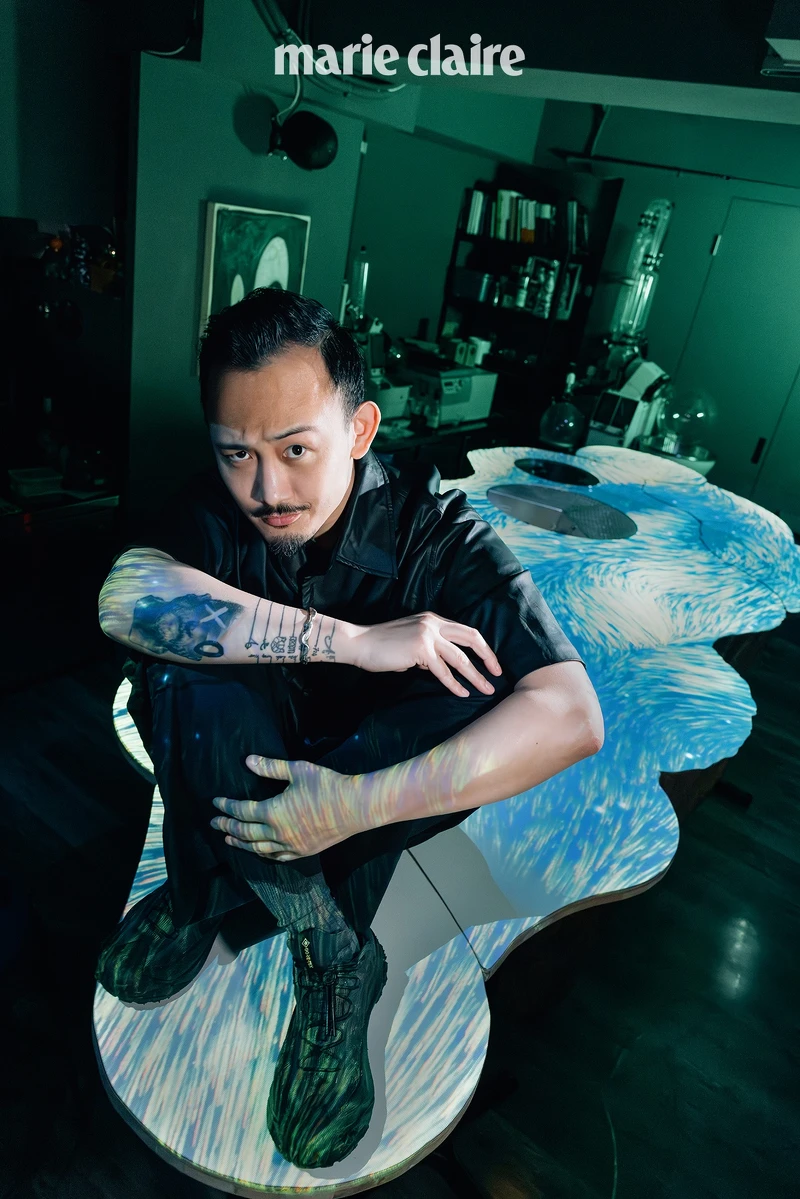 推開布簾,從樓下的日式簡約走進二樓,空間感瞬間切換,宛如穿越至另一次元。旋轉(zhuǎn)蒸發(fā)器與蒸餾瓶錯落其間,不規(guī)則曲線的桌面在光影之中失去明確邊界,看起來像懸浮在半空。這里曾是 Seven 的實驗室與備料室,如今轉(zhuǎn)身成為僅容納約14人的沉浸式場域。