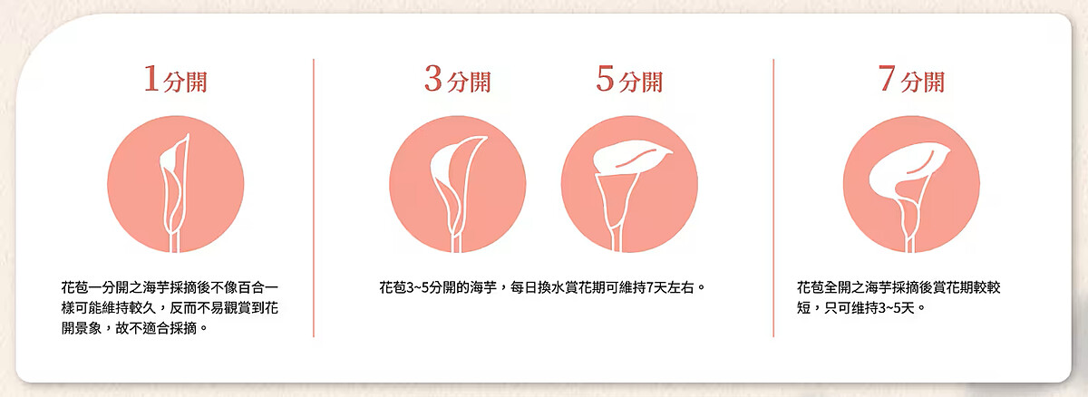 官網(wǎng)叮嚀要勤于換水,并在每次換水后,將海芋花莖基部切除1~2公分。而隨著時序轉(zhuǎn)熱,海芋瓶插時間也會跟著縮短,四月中以3~5分開為最好,賞花期可維持10天左右,而若花苞已接近全開,賞花期則只能維持3~5天,要把握時間欣賞海芋之美。另外可將市售切花保鮮劑加入水中保鮮,若天氣太熱,可在水中加入冰塊幫忙降溫。