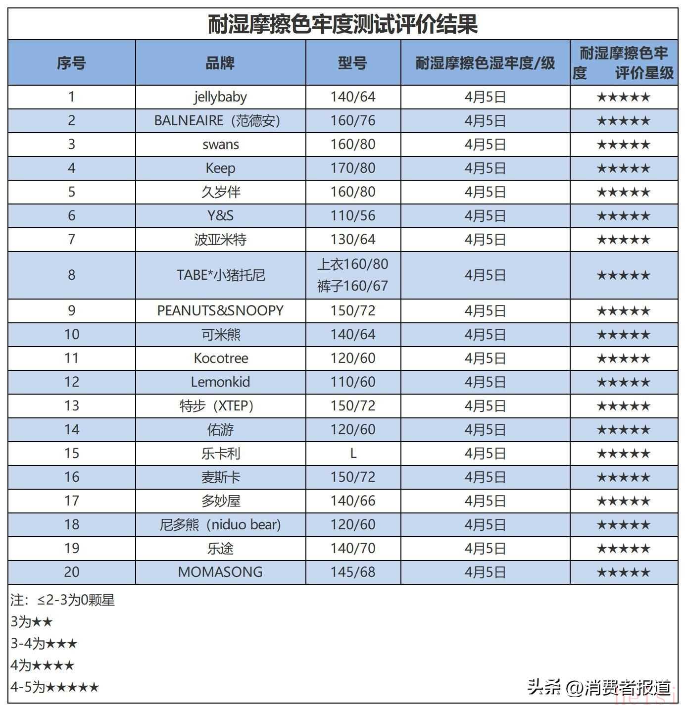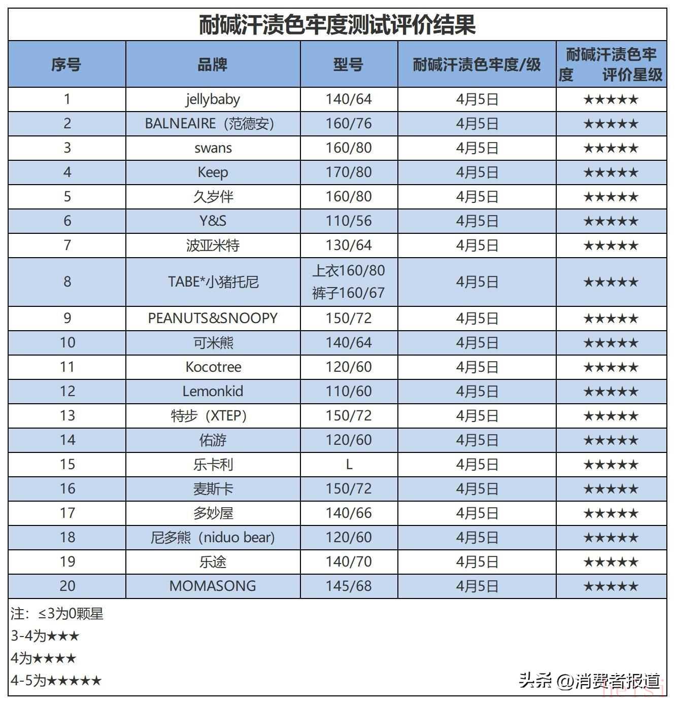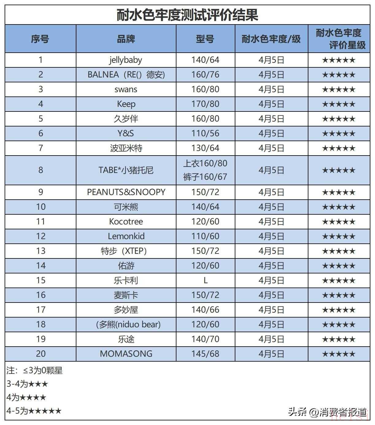 依據(jù)相關(guān)標(biāo)準(zhǔn),檢測符合要達(dá)到≥3-4級,檢測數(shù)據(jù)一般為4-5級為最好。20款樣品檢測數(shù)據(jù)均為4-5級,全部評為五星,具體評價結(jié)果如下。