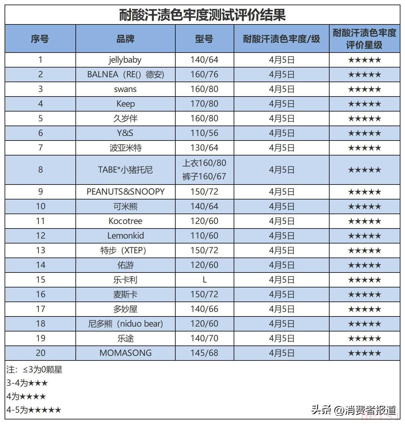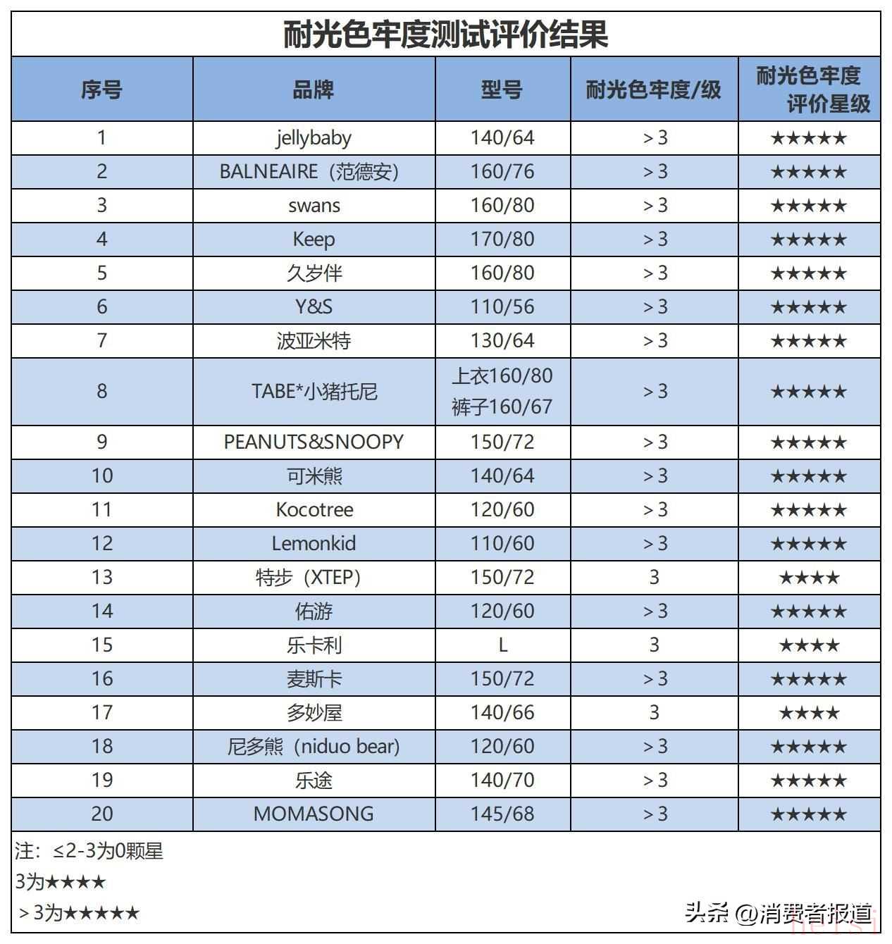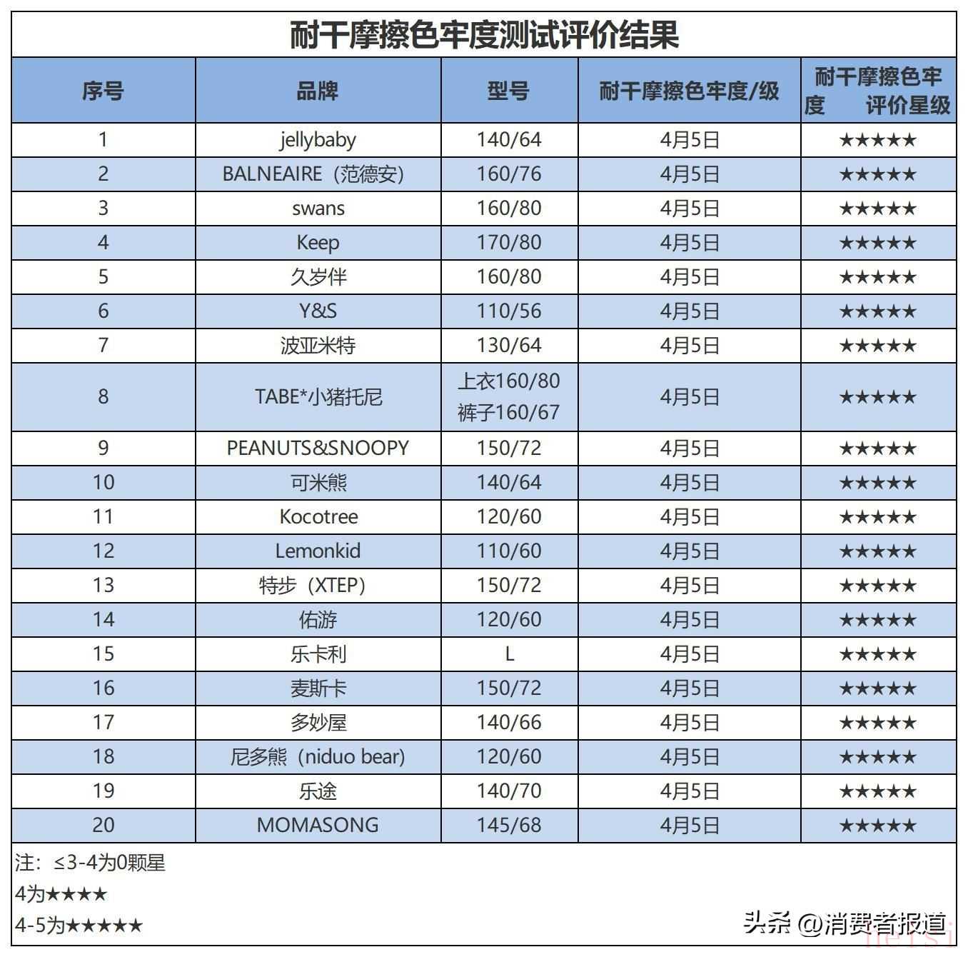 依據(jù)相關(guān)標(biāo)準(zhǔn),檢測符合要達(dá)到≥3-4級,檢測數(shù)據(jù)一般為4-5級為最好。20款樣品檢測數(shù)據(jù)均為4-5級,全部評為五星,具體評價結(jié)果如下。