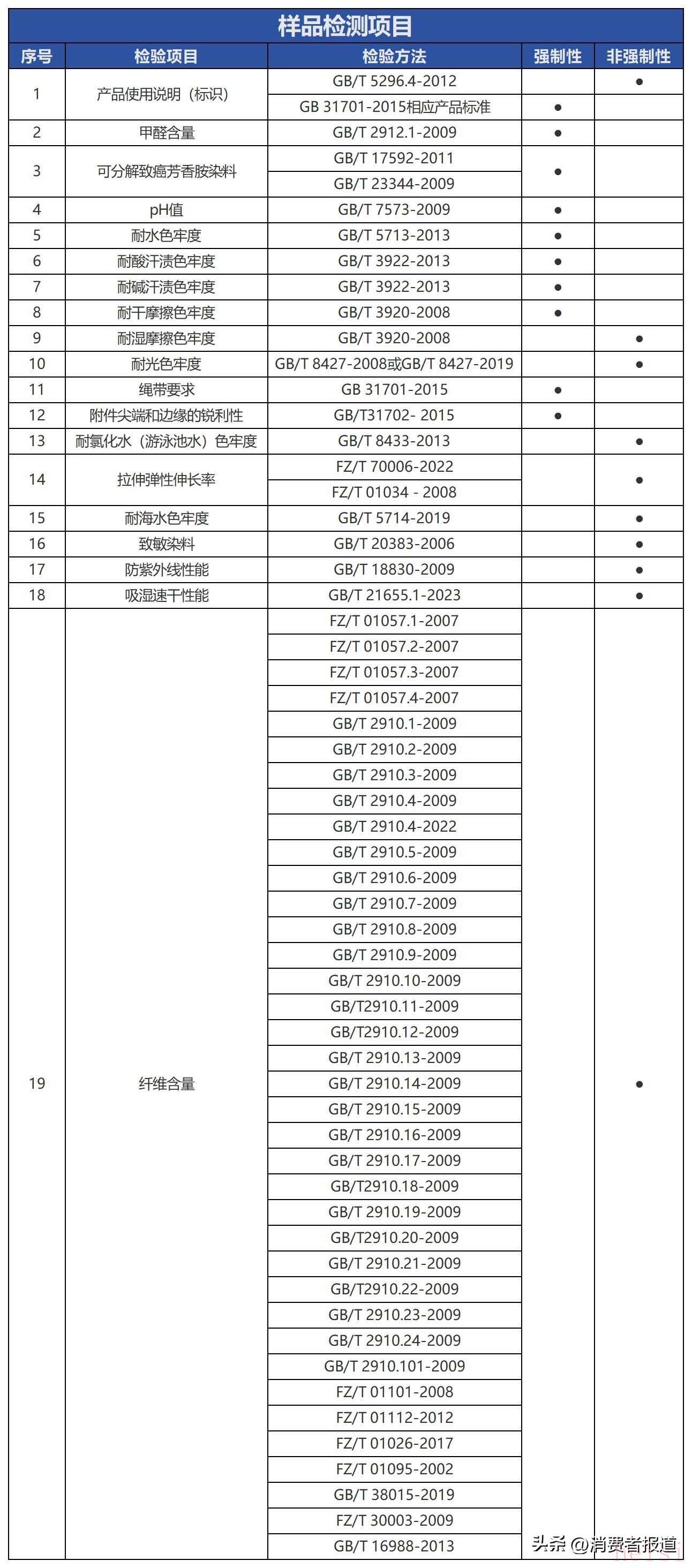 本次比較試驗(yàn),依據(jù)現(xiàn)行的國家標(biāo)準(zhǔn)以及行業(yè)標(biāo)準(zhǔn)對20款樣品分別進(jìn)行了測試。對其中15款在銷售平臺宣稱有防紫外線或吸濕速干功能的樣品進(jìn)行相對應(yīng)功能的檢測。因此,對20款樣品分別進(jìn)行了17、18、19項(xiàng)強(qiáng)制性或非強(qiáng)制性項(xiàng)目的測試。