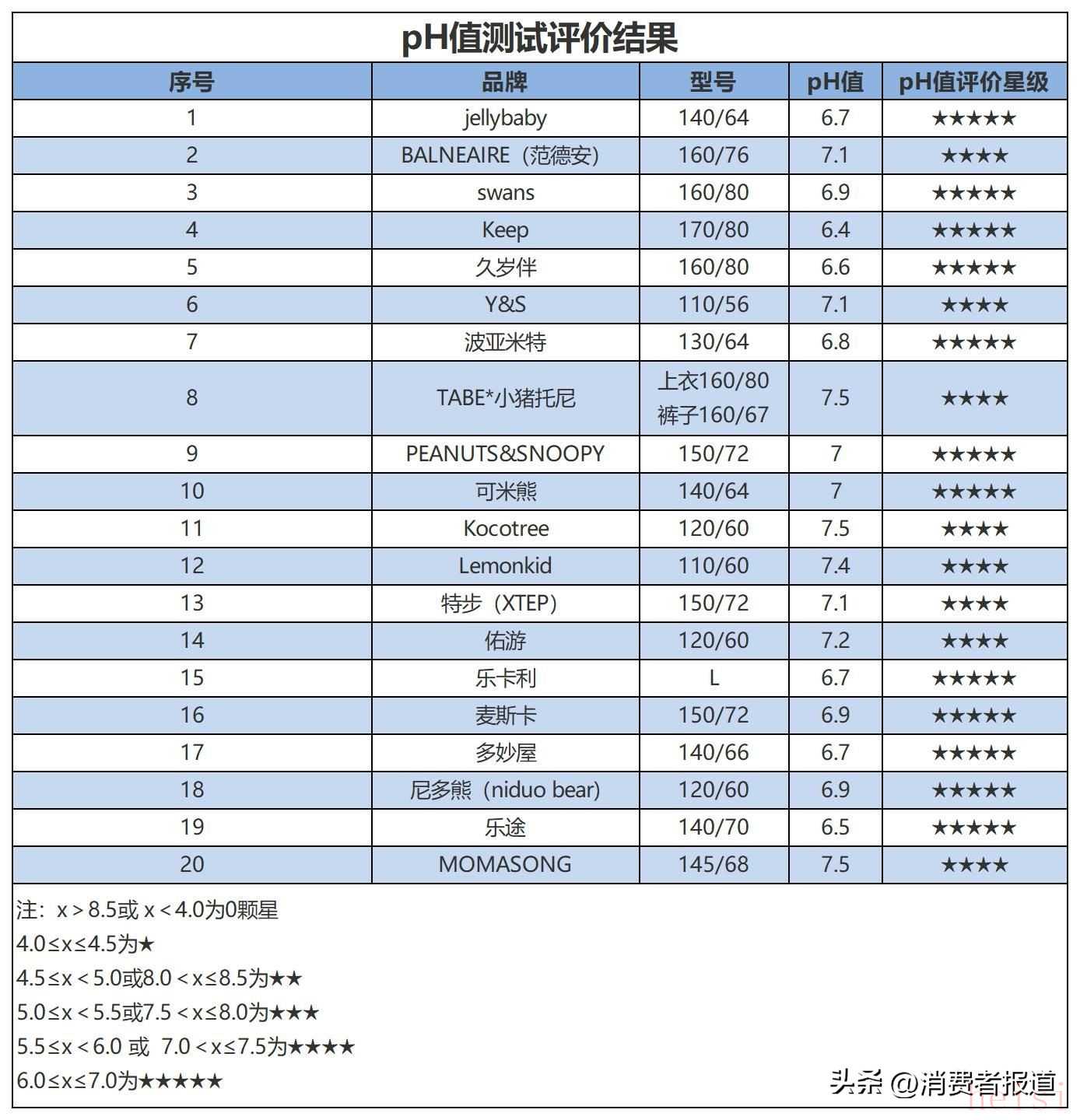 本項(xiàng)測試依據(jù)標(biāo)準(zhǔn)要求pH值4.0~8.5,20款樣品均符合標(biāo)準(zhǔn)要求。其中pH值7.0為中性,中性或弱酸性對皮膚相對較好,12款樣品結(jié)果在6.0-7.0之間,評為五星;其他8款樣品評為四星,具體評價結(jié)果如下。
