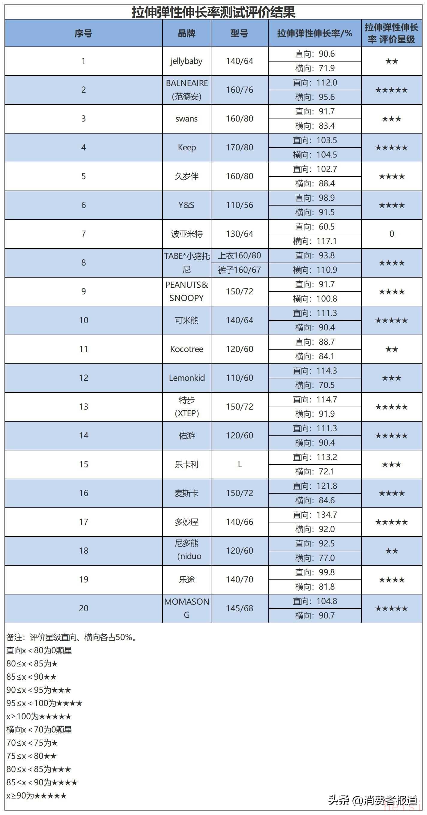 依據(jù)相關(guān)標(biāo)準(zhǔn),直向≥80%、橫向≥70%,其數(shù)值越大表示彈性越好。20款樣品中,有1款品牌是波亞米特拉伸彈性伸長率為直向60.5%,不參與評星。7款樣品測試結(jié)果優(yōu)異,評為五星;另有6款樣品評為四星,3款樣品評為三星,3款樣品評為二星;具體評價結(jié)果如下。