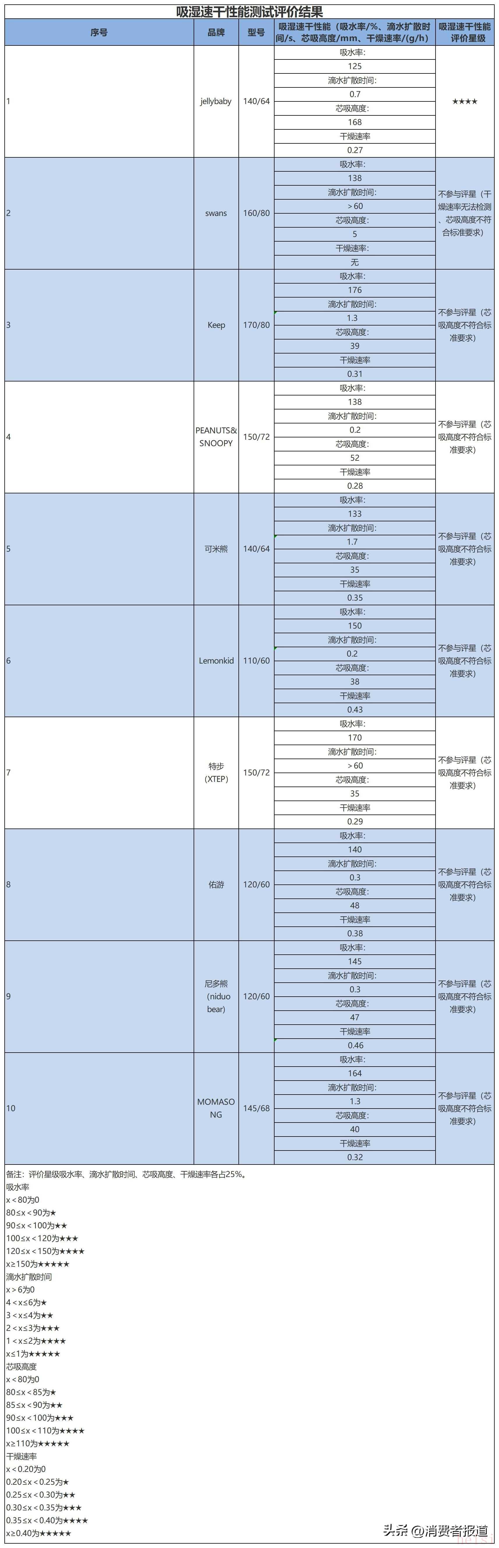 依據(jù)相關(guān)標(biāo)準(zhǔn),吸濕速干性能評價包括吸水率、滴水?dāng)U散時間、芯吸高度以及干燥速率四個項(xiàng)目。吸水率指試樣在水中完全浸潤后取出至無滴水時,試樣所吸取的水分對試樣原始質(zhì)量的百分率,標(biāo)準(zhǔn)要求吸水率≥80%,數(shù)值越大吸水能力越強(qiáng)。滴水?dāng)U散時間是指將水滴在試樣上,從水滴接觸試樣至其完全擴(kuò)散并滲透至織物內(nèi)所需要的時間,標(biāo)準(zhǔn)要求滴水?dāng)U散時間≤ 6s,時間越短速度越快。芯吸高度是指試驗(yàn)材料毛細(xì)效應(yīng)的度量,即垂直懸掛的紡織材料一端被水浸濕時,水通過毛細(xì)管作用,在一定時間內(nèi)沿紡織材料上升的高度,標(biāo)準(zhǔn)要求芯吸高度≥80mm,其數(shù)值越大織物傳導(dǎo)水分的能力越強(qiáng)。干燥速率是指單位時間內(nèi)試樣中水分的蒸發(fā)量,標(biāo)準(zhǔn)要求干燥速率≥0.20g/h,數(shù)值越大水分蒸發(fā)越快。只有四個項(xiàng)全部符合的產(chǎn)品才具有吸濕速干性能。本次比較試驗(yàn)的10款樣品均在網(wǎng)頁上標(biāo)稱有速干功能,但實(shí)際吊牌未標(biāo)注。其中1款品牌為jellybaby四個項(xiàng)目檢測數(shù)據(jù)全部滿足標(biāo)準(zhǔn)要求,評為四星;另外9款有部分項(xiàng)目不滿足具有吸濕速干性能的要求(其中swans芯吸高度不滿足、干燥速率無法檢測,其他8款樣品的芯吸高度均不滿足吸濕速干性能的要求),不參與評星。具體評價結(jié)果如下。