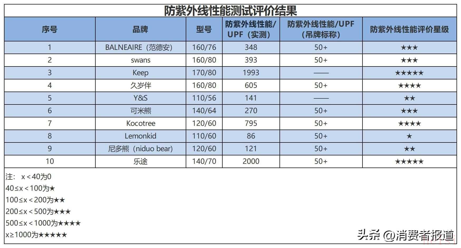 依據(jù)相關(guān)標(biāo)準(zhǔn),紫外線(波段在10-400nm)防護(hù)系數(shù)UPF (Ultraviolet Protection Factor),又稱紫外線遮擋系數(shù),是表示織物防護(hù)紫外線的能力。根據(jù)國家標(biāo)準(zhǔn)中的定義,UPF指的是“皮膚無防護(hù)時計(jì)算出的紫外線輻射平均效應(yīng)與皮膚有織物防護(hù)時計(jì)算出的紫外線輻射平均效應(yīng)的比值”,要求UPF≥40,數(shù)值越大防護(hù)能力越強(qiáng),商家可以根據(jù)自身的產(chǎn)品性能進(jìn)行標(biāo)注(如:UPF40+或UPF50+)。T(UVA)是指UVA(波段在315-400nm的紫外線)的透過率,UVA也稱曬黑段:此波段的紫外線很少被臭氧層吸收,大部分可到達(dá)滌棉,并穿透人體真皮,傷害皮膚的骨膠原蛋白和彈性蛋白,久之使皮膚老化,失去彈性,出現(xiàn)皺紋,黑色素沉積,標(biāo)準(zhǔn)要求T(UVA)AV必須小于5%。當(dāng)T(UVA)AV?5%且UPF檢測結(jié)果≥40時,則符合要求。本次檢測結(jié)果中,所有樣品的T(UVA)AV值都小于5%,符合標(biāo)準(zhǔn)要求,所以本次比較試驗(yàn)以UPF值作為參考。10款樣品中,Keep、Y&S 2款僅在網(wǎng)頁上標(biāo)稱有防紫外線性能,另外8款在網(wǎng)頁上和吊牌上均標(biāo)稱有防紫外線性能,且檢測數(shù)據(jù)都超過了吊牌所標(biāo)稱的數(shù)值。其中有2款樣品測試結(jié)果優(yōu)異,評為五星;另有2款樣品評為四星,3款樣品評為三星,2款樣品評為二星,1款樣品評為一星;具體評價結(jié)果如下。