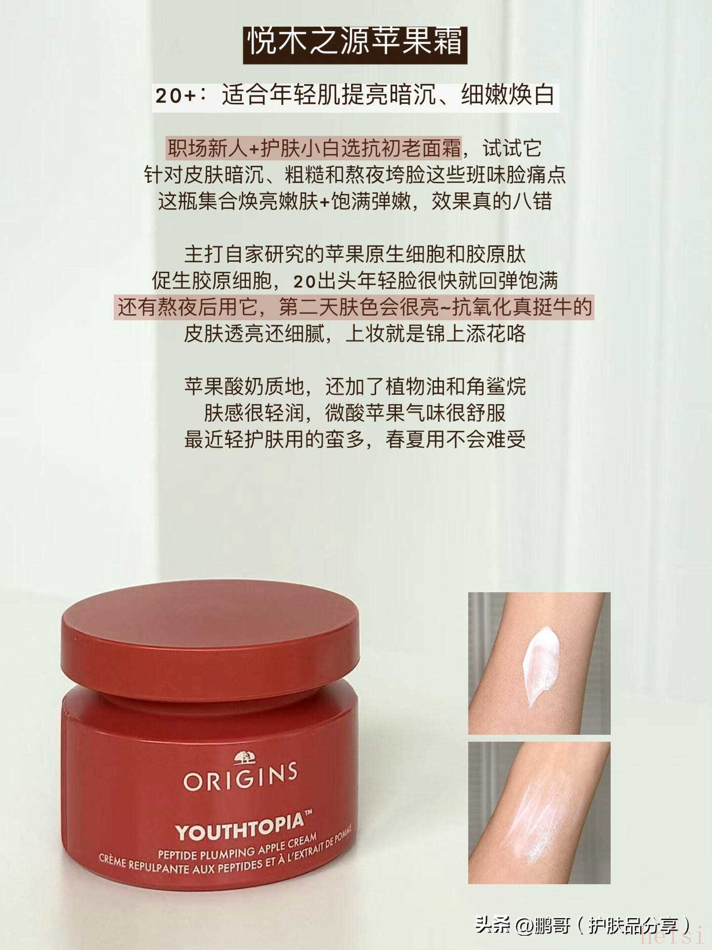 而且還有17型重組膠原蛋白,補(bǔ)膠原抗初老,所以從20-25這個(gè)階段其實(shí)都能覆蓋到。它是有兩種質(zhì)地的,春夏可以選輕盈版,質(zhì)地柔潤(rùn)舒服,保濕也妥妥夠用,敏肌家中常備的修護(hù)維穩(wěn)霜,有它心里就有底。干敏肌換季屏障受損的可以看這個(gè),綿軟的奶霜質(zhì)地,推開(kāi)很絲滑,肌膚干燥泛紅爆皮的地方可以多用一些,我一般喜歡掌心搓熱以后再按壓上臉使用。主打三重神經(jīng)酰胺脂質(zhì)體+乳清蛋白,可以深層滋潤(rùn)肌膚的同時(shí)修護(hù)受損,吸收完以后感覺(jué)整個(gè)肌膚都水嫩嫩的,像扒開(kāi)毛孔給肌膚灌水即視感,細(xì)水長(zhǎng)流式的給干敏肌養(yǎng)出“厚臉皮”。第二款:悅木之源蘋(píng)果霜職場(chǎng)新人+護(hù)膚小白選抗初老面霜,試試它,針對(duì)皮膚暗沉、粗糙和熬夜垮臉這些班味臉痛點(diǎn),這瓶集合煥亮嫩膚+飽滿彈嫩,效果真的不錯(cuò),主打自家研究的蘋(píng)果原生細(xì)胞和膠原肽,促生膠原細(xì)胞,20出頭年輕臉很快就回彈飽滿。