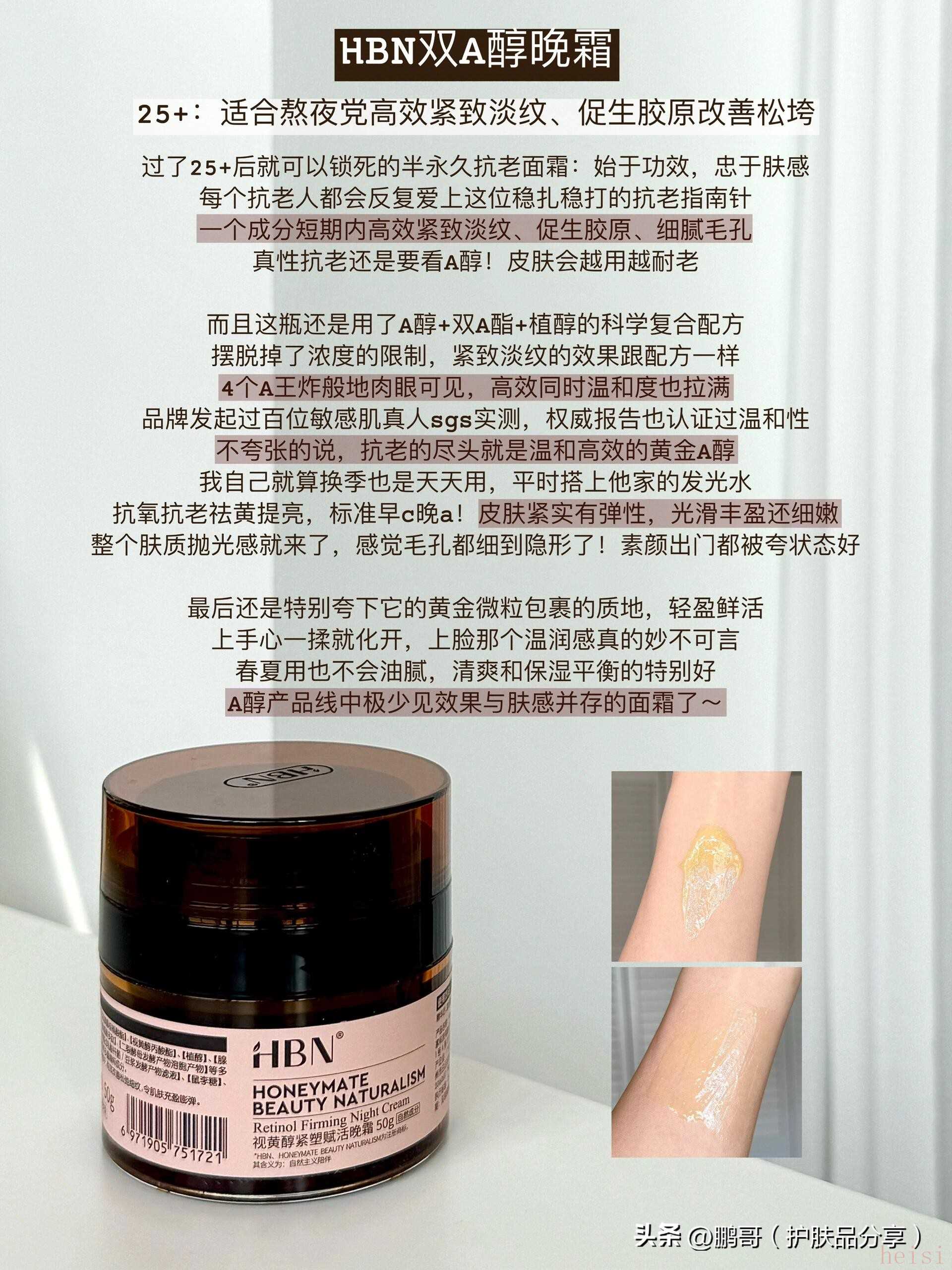還有熬夜后用它,第二天膚色會(huì)很亮,抗氧化真挺牛的,皮膚透亮還細(xì)膩,上妝就是錦上添花。蘋(píng)果酸奶質(zhì)地,還加了植物油和角鯊?fù)椋w感很輕潤(rùn),微酸蘋(píng)果氣味很舒服,最近輕護(hù)膚用的蠻多,春夏用不會(huì)難受。5w顆蘋(píng)果原生細(xì)胞促生膠原母細(xì)胞,讓小垮臉支楞起來(lái),用200%抗氧力的發(fā)酵蘋(píng)果纖維對(duì)暗沉黃氣重拳出擊,還有制裁干紋糙臉的蘋(píng)果籽油+角鯊?fù)椤?/span>用下來(lái)蘋(píng)果肌那塊感覺(jué)嘭嘭彈彈的,臉蛋子又嫩又彈又透亮,咋看咋漂亮,熬夜加班用它,第二天完全木有熬大夜的痕跡,有種沒(méi)當(dāng)過(guò)牛馬,生機(jī)滿滿的美,真的按頭安利給25+打工人閉眼沖。第三款:HBN雙A醇晚霜過(guò)了25+后就可以鎖死的半永久抗老面霜:始于功效,忠于膚感,每個(gè)抗老人都會(huì)反復(fù)愛(ài)上這位穩(wěn)扎穩(wěn)打的抗老指南針,一個(gè)成分短期內(nèi)高效緊致淡紋、促生膠原、細(xì)膩毛孔。