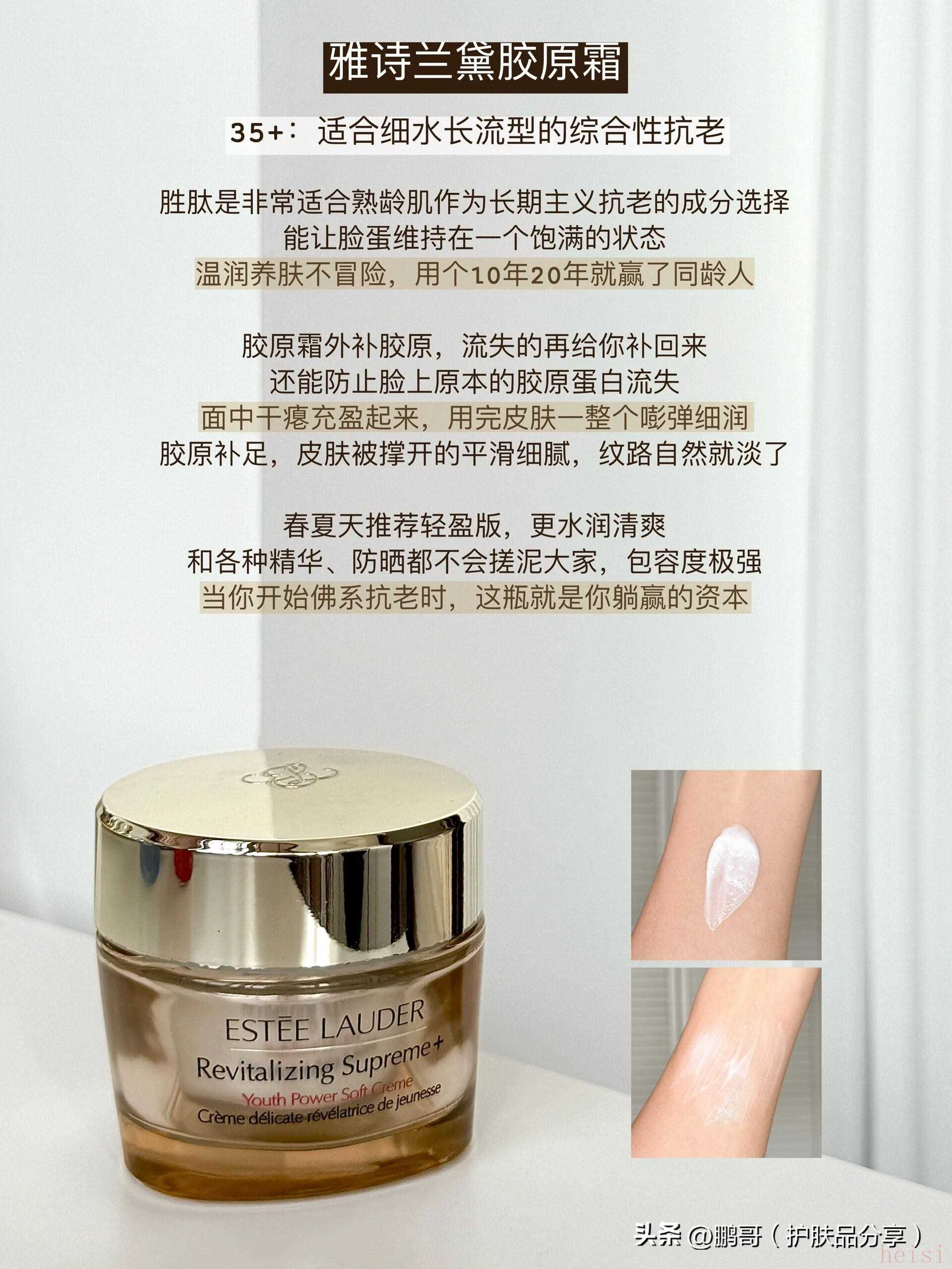 面中干癟充盈起來(lái),用完皮膚一整個(gè)嘭彈細(xì)潤(rùn),膠原補(bǔ)足,皮膚被撐開(kāi)的平滑細(xì)膩,紋路自然就淡了,春夏天推薦輕盈版,更水潤(rùn)清爽,和各種精華、防曬都不會(huì)搓泥大家,包容度極強(qiáng),當(dāng)你開(kāi)始佛系抗老時(shí),這瓶就是你躺贏的資本。初階抗老這款面霜性價(jià)比真的很高,很適合輕齡肌,用完臉蛋是那種慢慢看得見(jiàn)的飽滿嘭彈,乳霜款質(zhì)地柔滑,像酸奶一樣用起來(lái)很好吸收,整體膚感很輕盈滋潤(rùn),夏天用沒(méi)什么負(fù)擔(dān)。像是混油皮或者油皮也能秋冬季節(jié)用,剛開(kāi)始用還不太明顯,但堅(jiān)持用真的會(huì)細(xì)膩嘭彈很多,流失的膠原蛋白這下都給補(bǔ)回來(lái)啦,輕齡肌可以碼住。總結(jié):不同年齡的抗老面霜,哪些值得推薦?這6款大牌抗老面霜值得入手,想要抗老,先從面霜入手。對(duì)于不同的年齡段,選擇抗老面霜都有哪些標(biāo)準(zhǔn)嗎?一方面就是根據(jù)自己的護(hù)膚需求,另一方面就要了解這些面霜的作用,能否滿足你的護(hù)膚、抗老需求。很多人問(wèn),到底什么時(shí)候抗老合適,其實(shí)這個(gè)沒(méi)有什么標(biāo)準(zhǔn)的答案,在我們剛開(kāi)始有各種問(wèn)題的時(shí)候,就要認(rèn)真做好護(hù)膚、預(yù)防肌膚衰老,皮膚衰老也是一個(gè)累計(jì)的過(guò)程,提前做好預(yù)防,才是抗老的根本,最后分享6款適合各個(gè)年齡段的大牌抗老面霜,需要的,可以了解一下。我是鵬哥,每天堅(jiān)持分享各種護(hù)膚品知識(shí),喜歡的話可以關(guān)注我,感謝每天為我點(diǎn)贊的朋友們。部分圖片來(lái)源于網(wǎng)絡(luò),如有侵權(quán),聯(lián)系必刪!文字原創(chuàng):鵬哥學(xué)護(hù)膚