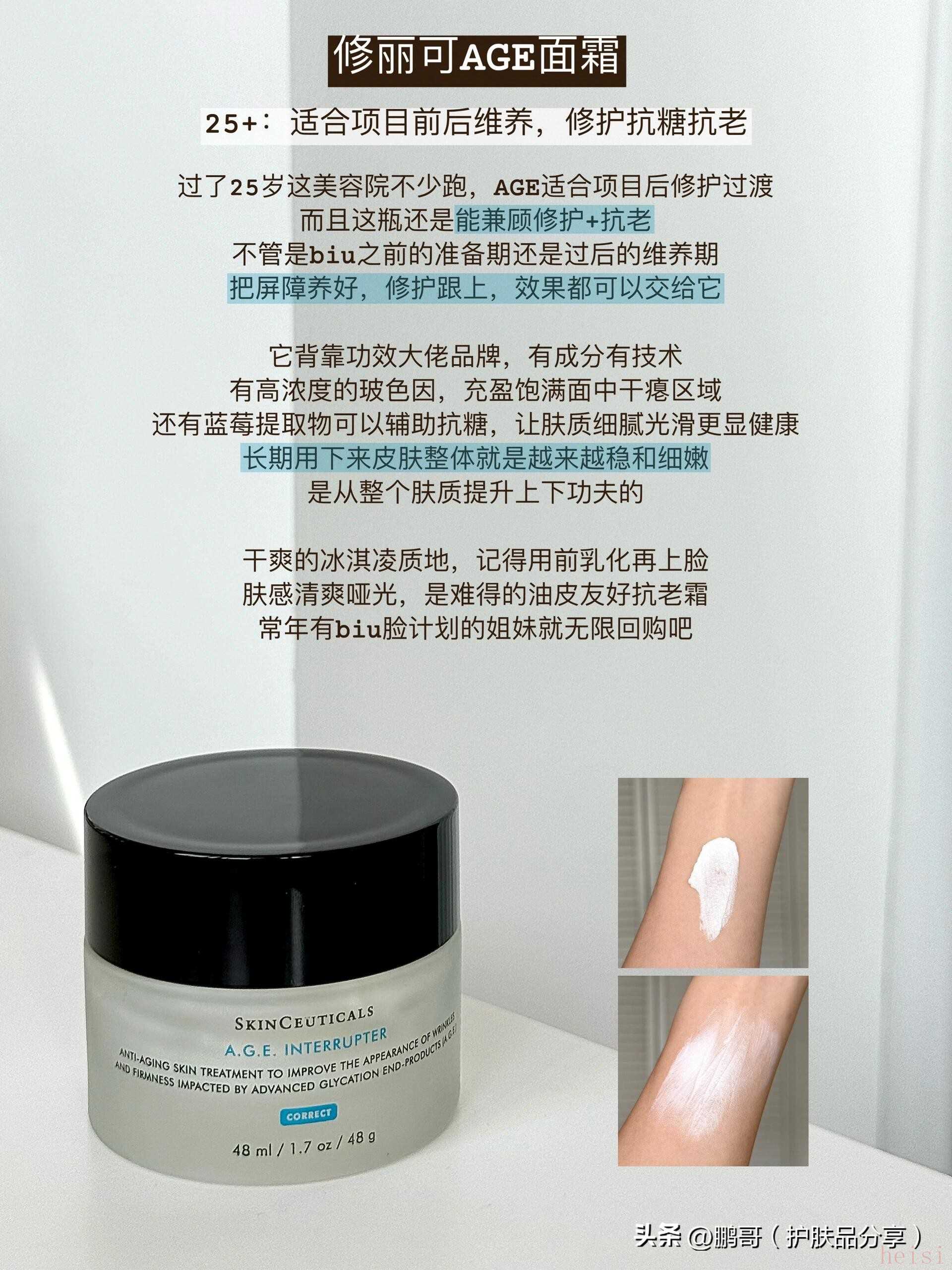真性抗老還是要看A醇,皮膚會(huì)越用越耐老,而且這瓶還是用了A醇+雙A酯+植醇的科學(xué)復(fù)合配方,擺脫掉了濃度的限制,緊致淡紋的效果跟配方一樣,4個(gè)A王炸般地肉眼可見(jiàn),高效同時(shí)溫和度也拉滿。品牌發(fā)起過(guò)百位敏感肌真人sgs實(shí)測(cè),權(quán)威報(bào)告也認(rèn)證過(guò)溫和性,不夸張的說(shuō),抗老的盡頭就是溫和高效的黃金A醇,我自己就算換季也是天天用。平時(shí)搭上他家的發(fā)光水,抗氧抗老祛黃提亮,標(biāo)準(zhǔn)早c晚a!皮膚緊實(shí)有彈性,光滑豐盈還細(xì)嫩,整個(gè)膚質(zhì)拋光感就來(lái)了,感覺(jué)毛孔都細(xì)到隱形了,素顏出門(mén)都被夸狀態(tài)好,A醇產(chǎn)品線中極少見(jiàn)效果與膚感并存的面霜了。第四款:修麗可AGE面霜過(guò)了25歲這美容院不少跑,AGE適合項(xiàng)目后修護(hù)過(guò)渡,而且這瓶還是能兼顧修護(hù)+抗老,不管是biu之前的準(zhǔn)備期還是過(guò)后的維養(yǎng)期,把屏障養(yǎng)好,修護(hù)跟上,效果都可以交給它。