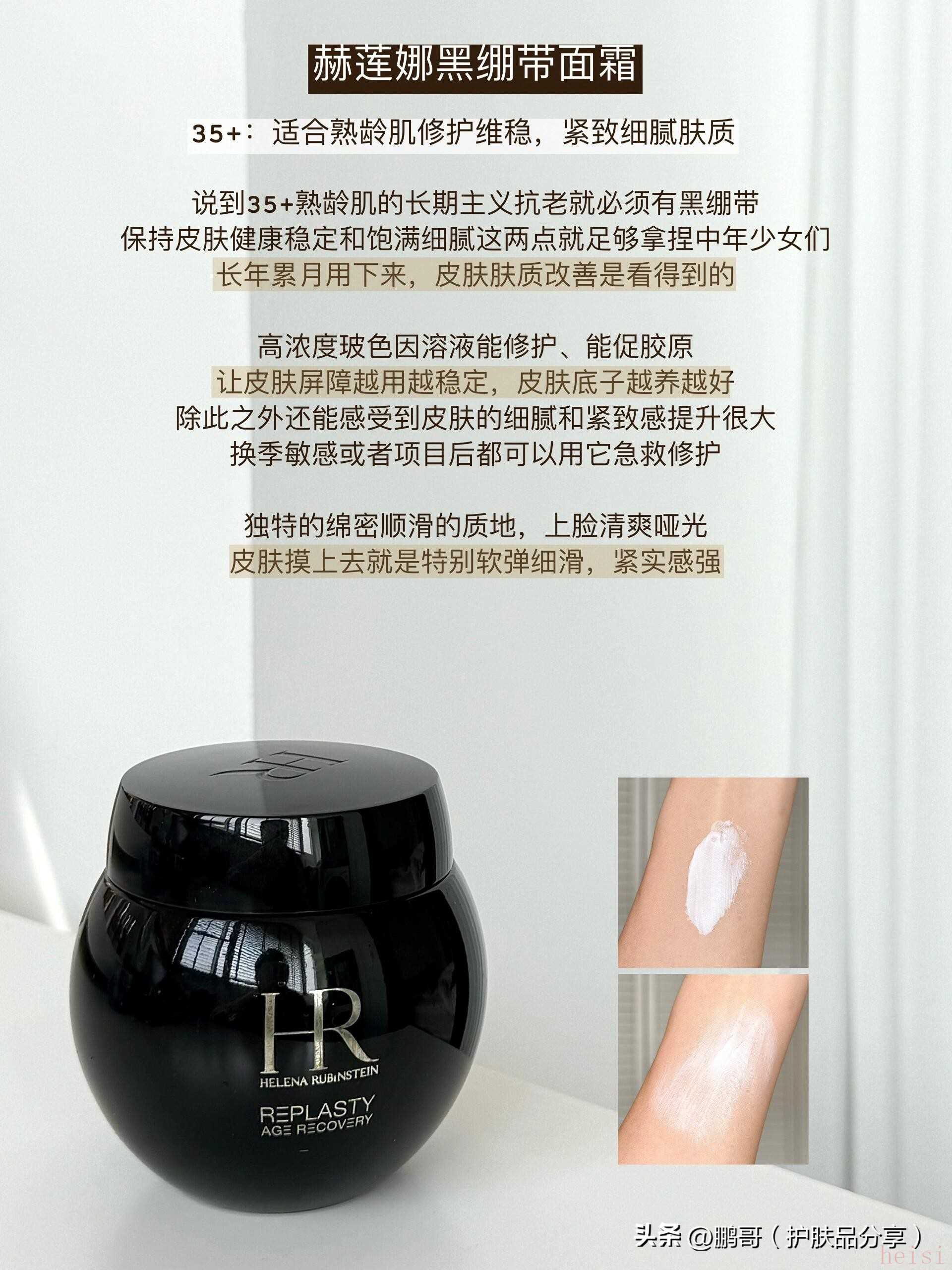 它背靠功效大佬品牌,有成分有技術(shù),有高濃度的玻色因,充盈飽滿面中干癟區(qū)域,還有藍(lán)莓提取物可以輔助抗糖,讓膚質(zhì)細(xì)膩光滑更顯健康,長(zhǎng)期用下來(lái)皮膚整體就是越來(lái)越穩(wěn)和細(xì)嫩,是從整個(gè)膚質(zhì)提升上下功夫的。干爽的冰淇凌質(zhì)地,記得用前乳化再上臉,膚感清爽啞光,是難得的油皮友好抗老霜,常年有biu臉計(jì)劃的姐妹就無(wú)限回購(gòu)吧!作為修麗可6年真愛(ài)粉,掏心窩推薦這瓶,AGE面霜一定是抗老道路上值得信任的伙伴。它背靠成分大佬品牌,濃度技術(shù)都在線,除了淡紋它更出彩的是抗糖,皮膚更不易暗沉。用完一瓶那個(gè)皮膚緊致和細(xì)膩度肉眼可見(jiàn),在大牌抗老面霜里算是性價(jià)比選手。質(zhì)地是干爽的士豆泥,上臉啞光一點(diǎn)不油膩,堅(jiān)持用幾年皮膚真的素顏都能打,可盲入。第五款:赫蓮娜黑繃帶面霜說(shuō)到35+熟齡肌的長(zhǎng)期主義抗老就必須有黑繃帶,保持皮膚健康穩(wěn)定和飽滿細(xì)膩這兩點(diǎn),就足夠拿捏中年少女們,長(zhǎng)年累月用下來(lái),皮膚膚質(zhì)改善是看得到的,高濃度玻色因溶液能修護(hù)、能促膠原,讓皮膚屏障越用越穩(wěn)定,皮膚底子越養(yǎng)越好。