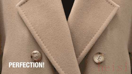 MaxMara從收回來的克什米爾羊毛中,篩選出同樣細(xì)長、堅(jiān)韌、彈性好的最優(yōu)質(zhì)的羊毛,和外形接近的羊絨相結(jié)合,用昂貴的專業(yè)機(jī)械輕推,紡織成最終用來做101801大衣的水波紋絨毛混紡面料。
