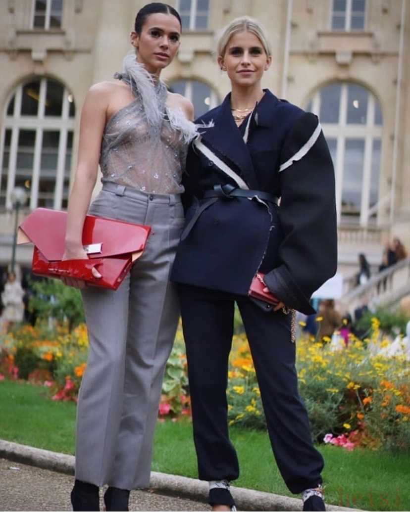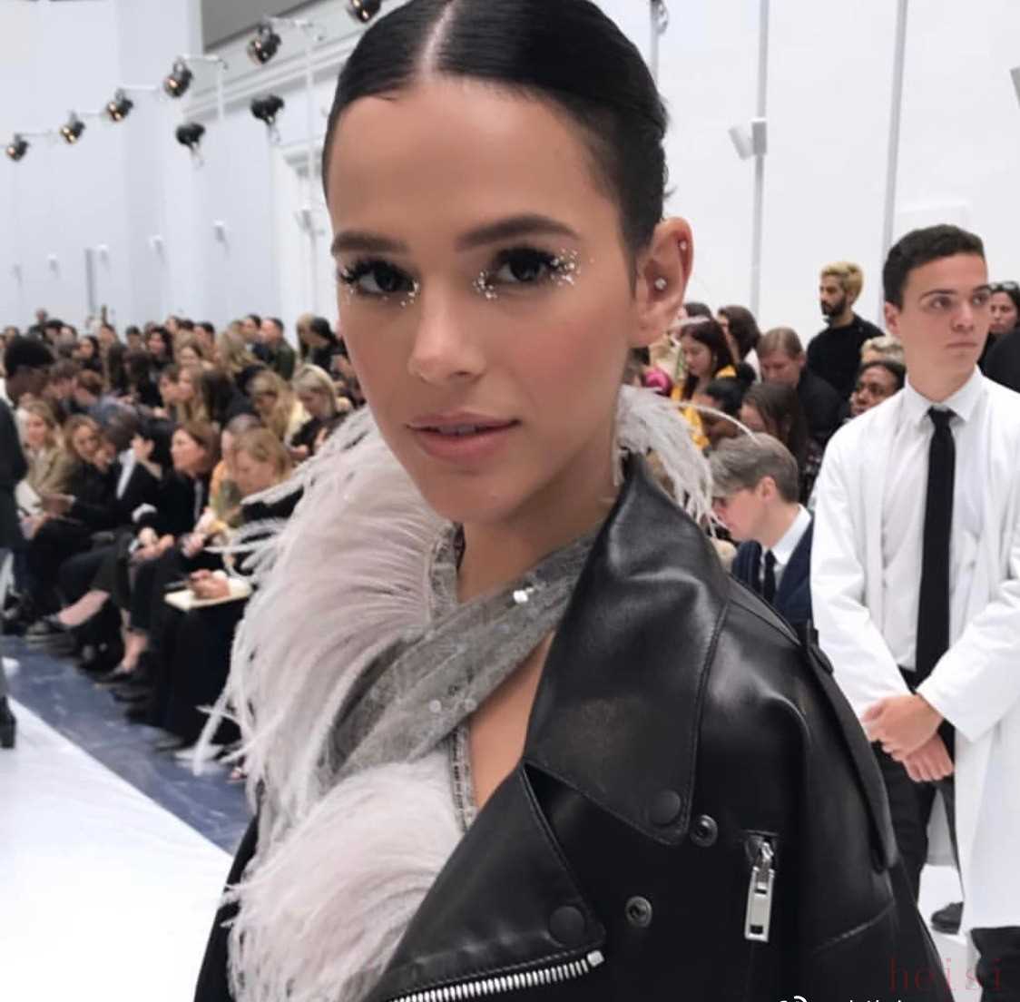 Bruna Marquezine身穿花瓣亮片蕾絲透視衫性感的過分,夸張的設計搭配亮片妝容,披上一件皮質外套將性感若隱若現(xiàn),高級又安全。Bruna Marquezine中性的穿搭正是體現(xiàn)了John Galliano對性別界限的模糊 。