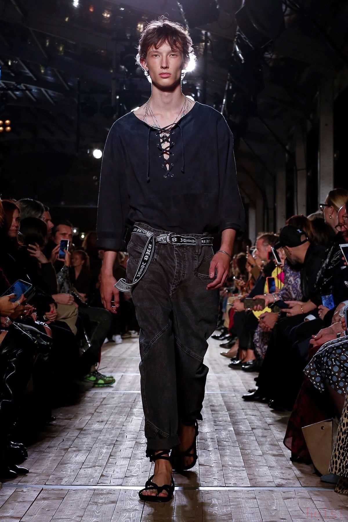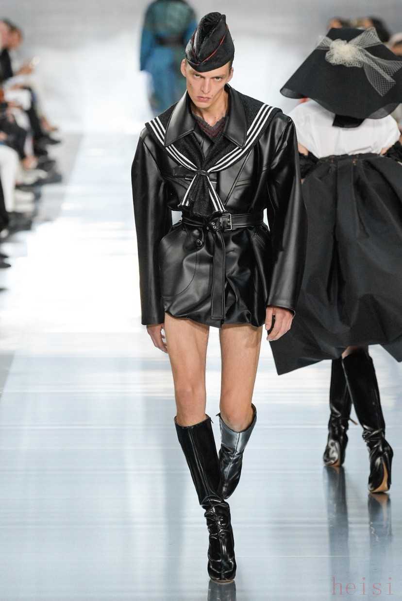 大秀的壓軸Look由德國男模Leon Dame演繹,海軍風的皮衣,不正經的步伐,給人印象深刻。而模糊性別界限、戲劇化十足的演繹,不正是海盜爺?shù)哪檬趾脩騿幔?/p>
