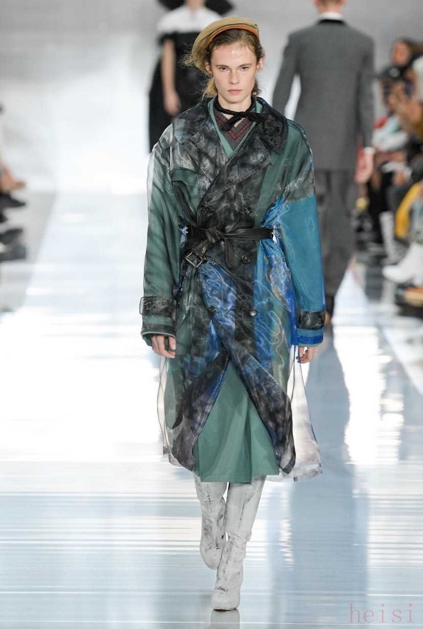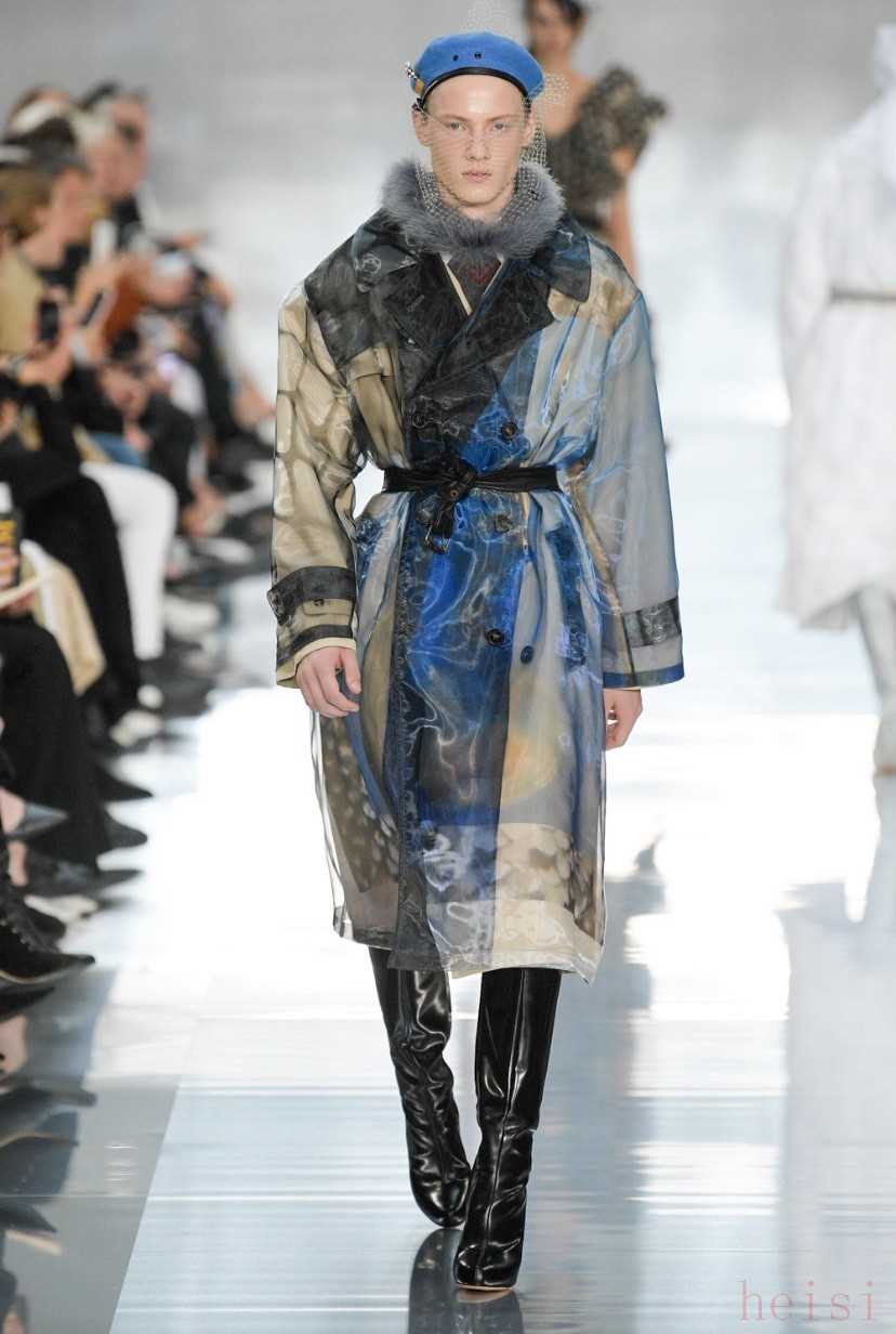 John Galliano利用錯視畫揭示了織物的真實身份,這一錯覺與投射的手工主題不期而遇。在這里,投射濾鏡將光線投射到半透明織物上的印痕轉化到印花透明硬紗的風衣上,有種光影模糊的層次感。