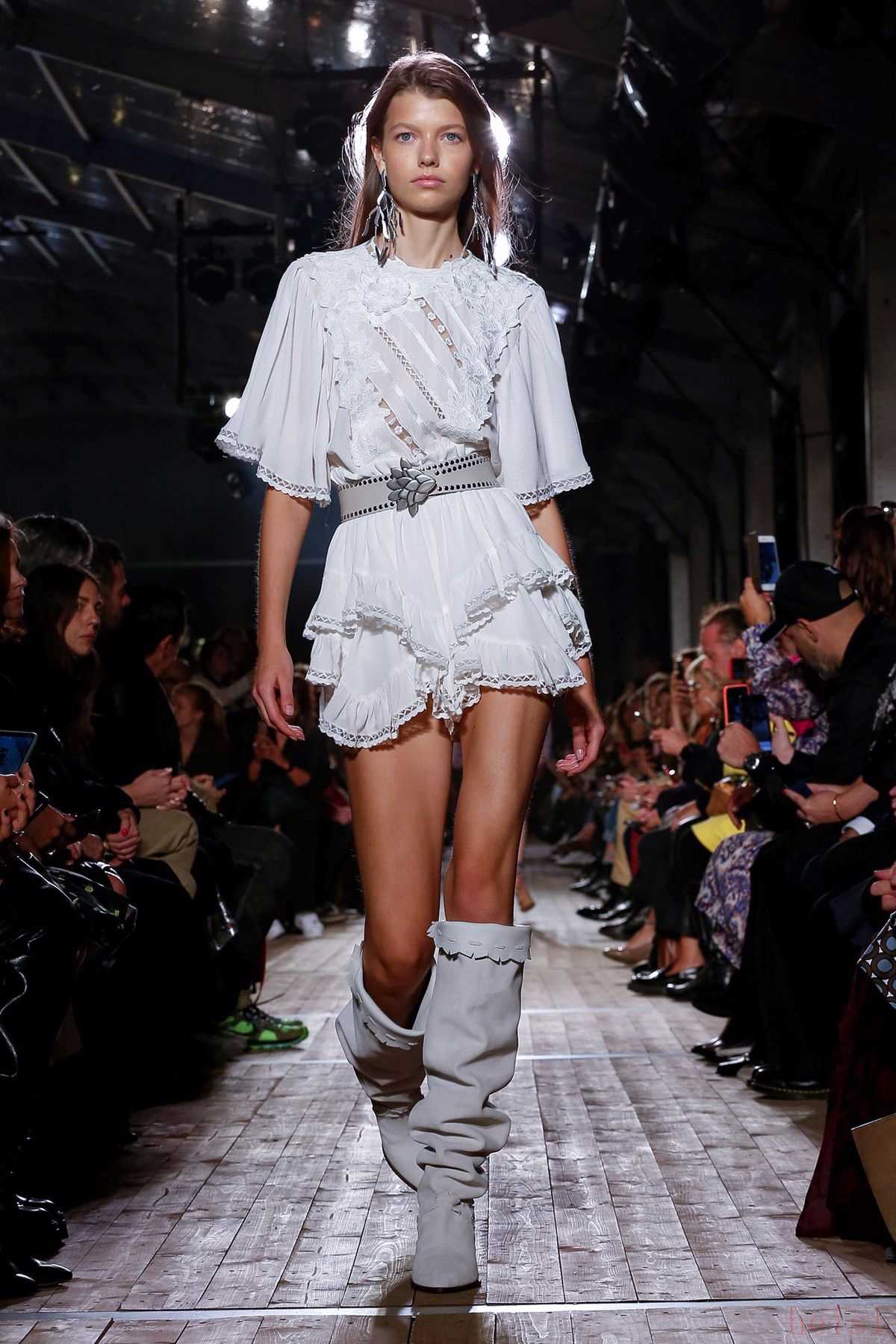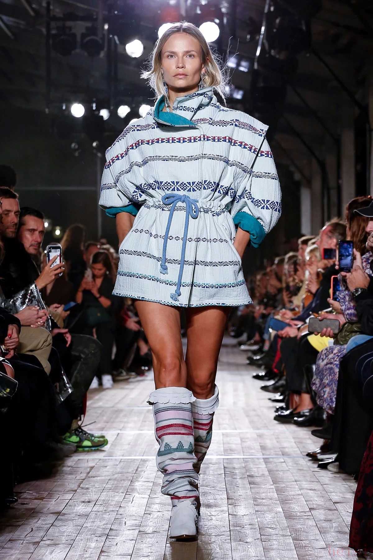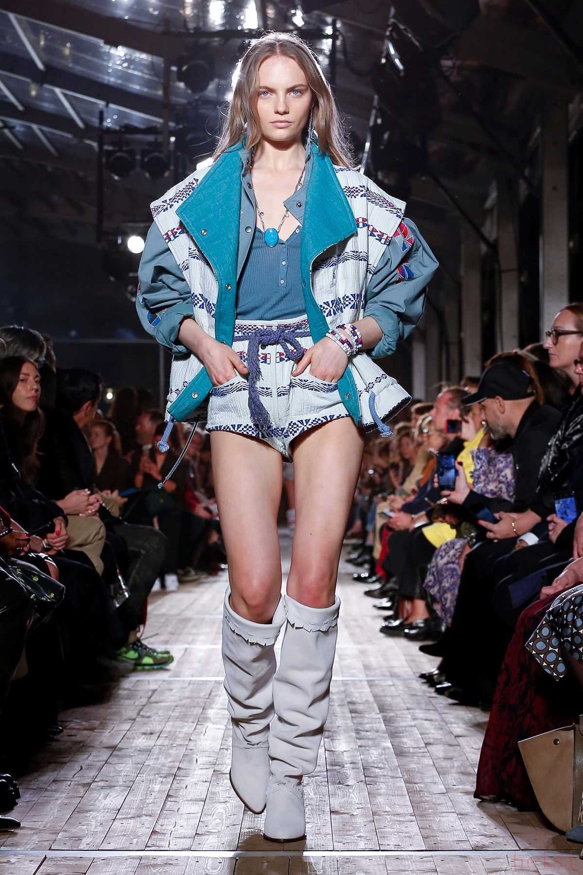 Isabel Marant一貫具有的復古感,也從原始牛仔的面料就能體現(xiàn)。天空般的藍色很好的緩解了碎花的繁雜,十分具有復古摩登感。