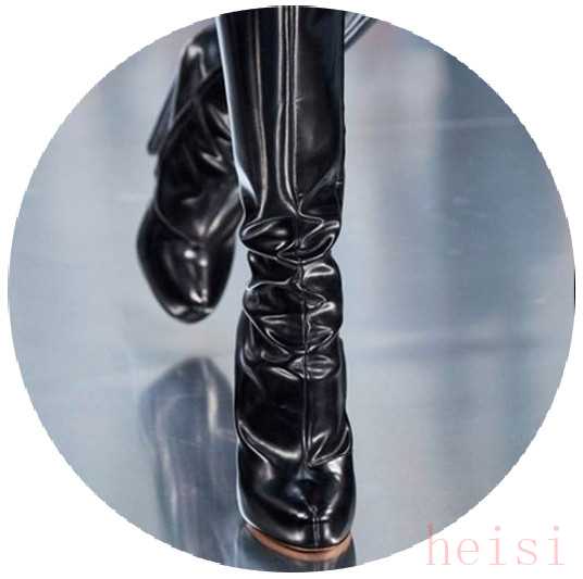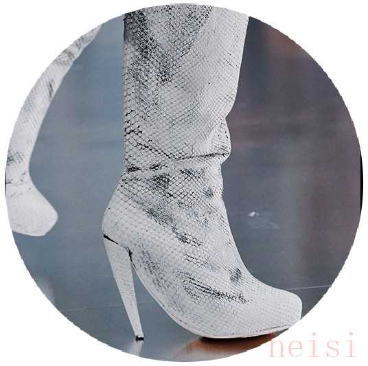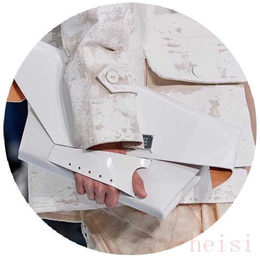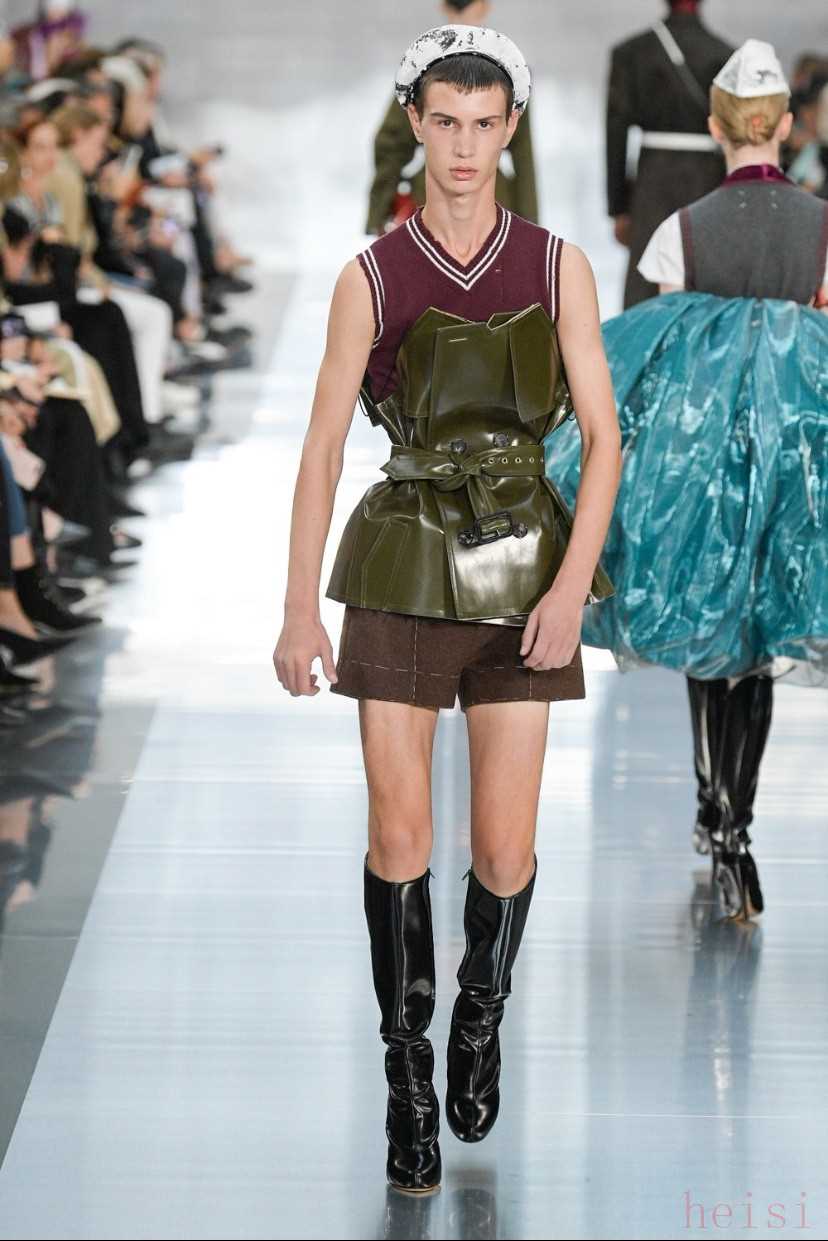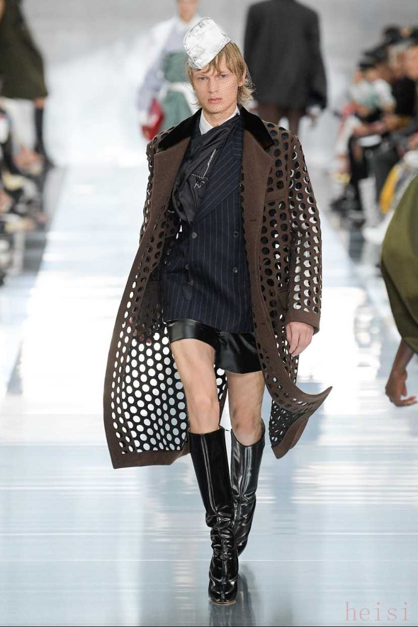 彎曲的高跟,黑色或棕色漆皮或白漆仿蟒皮靴,在手工的基礎上模糊性別界限,直擊潮流。