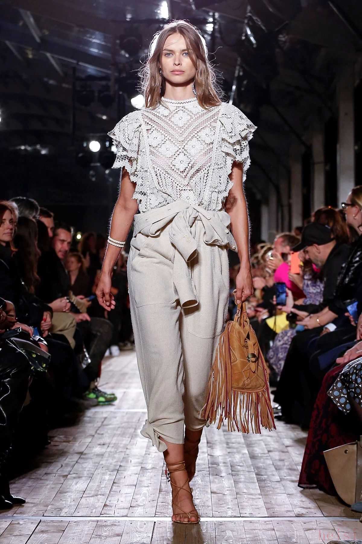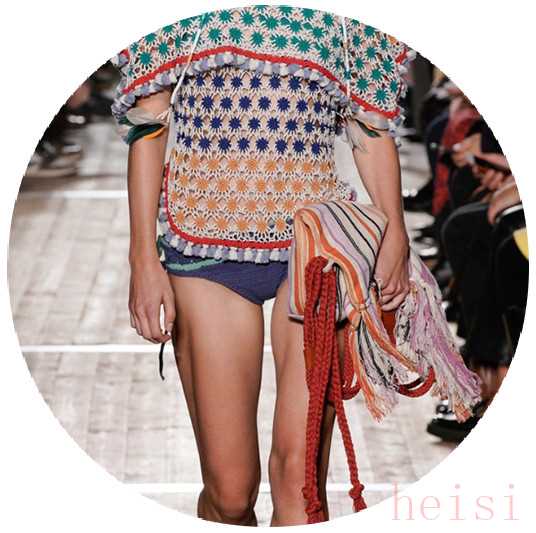 鉤花與蕾絲流蘇這種十分彰顯女性柔美優(yōu)雅的元素也出現(xiàn)在2020春夏系列,并且將柔美與帥氣集合的恰到好處,鉤花上衣與工裝褲的對比,流蘇的搖曳也跟具有民族風的鑲嵌工藝產生一種反差美。