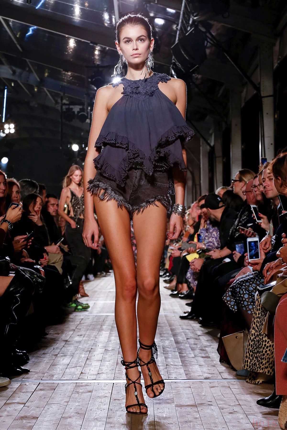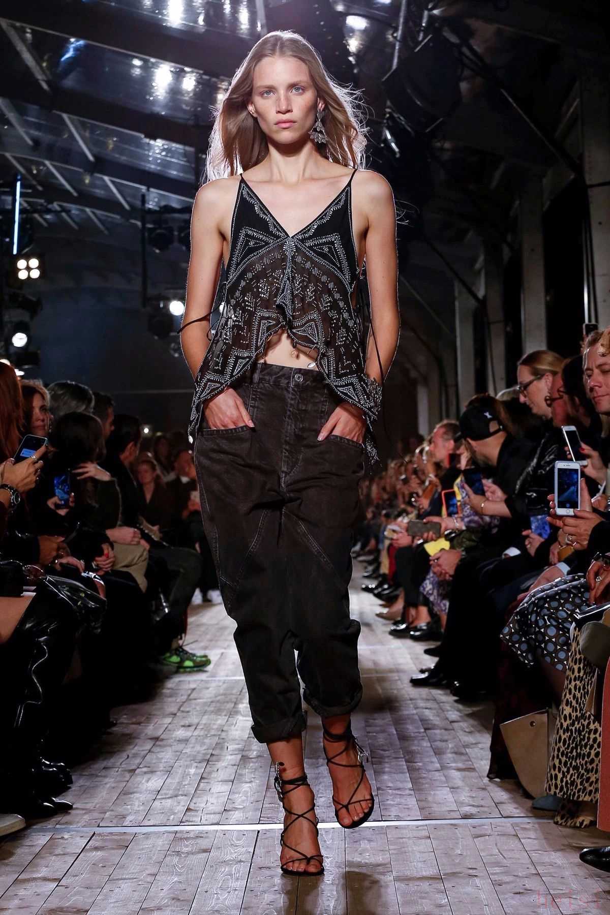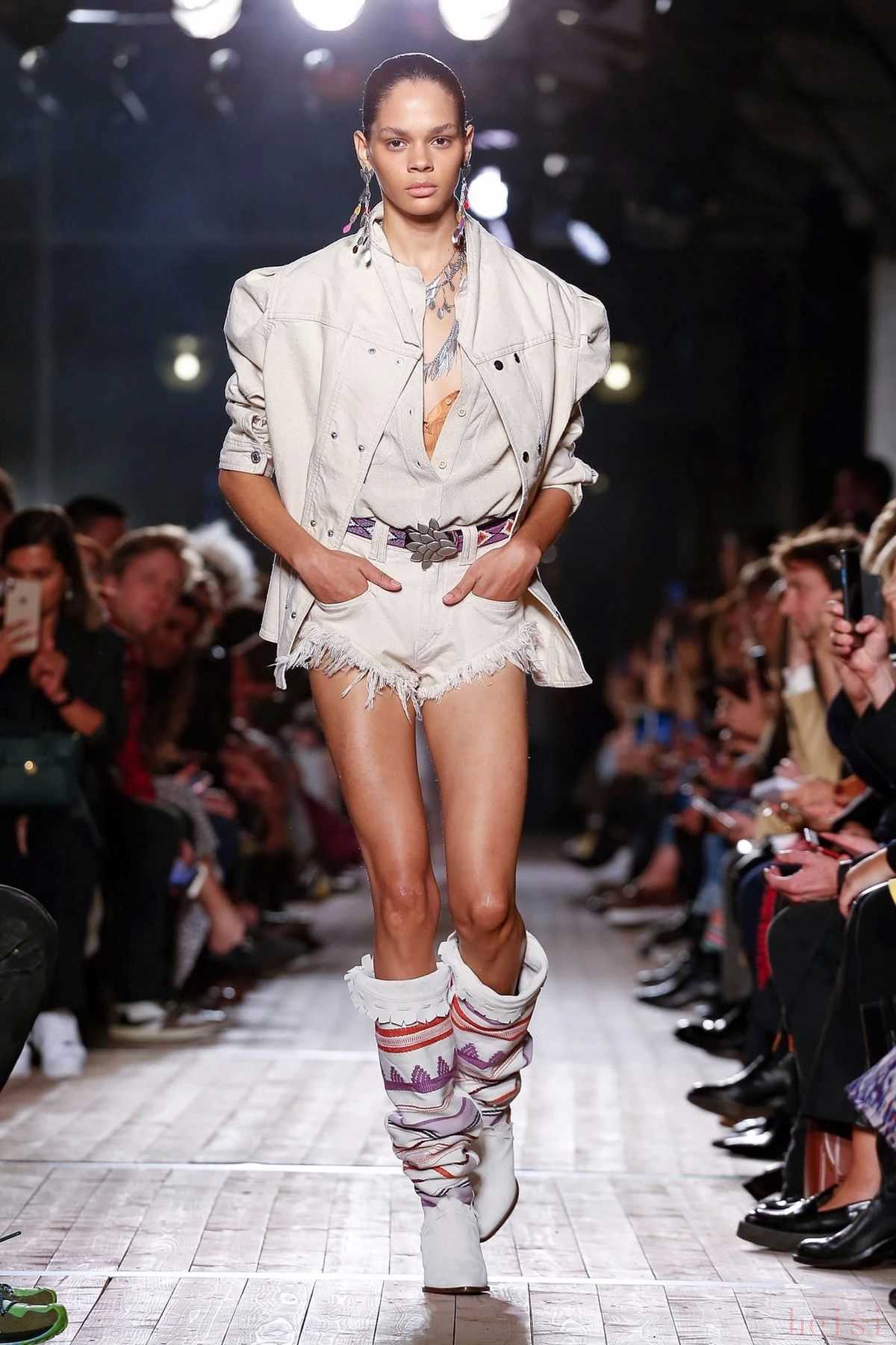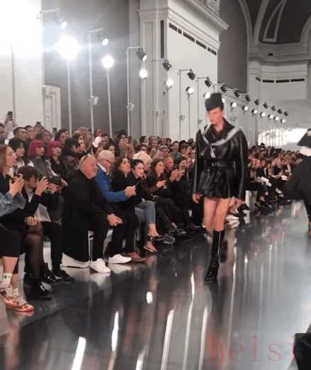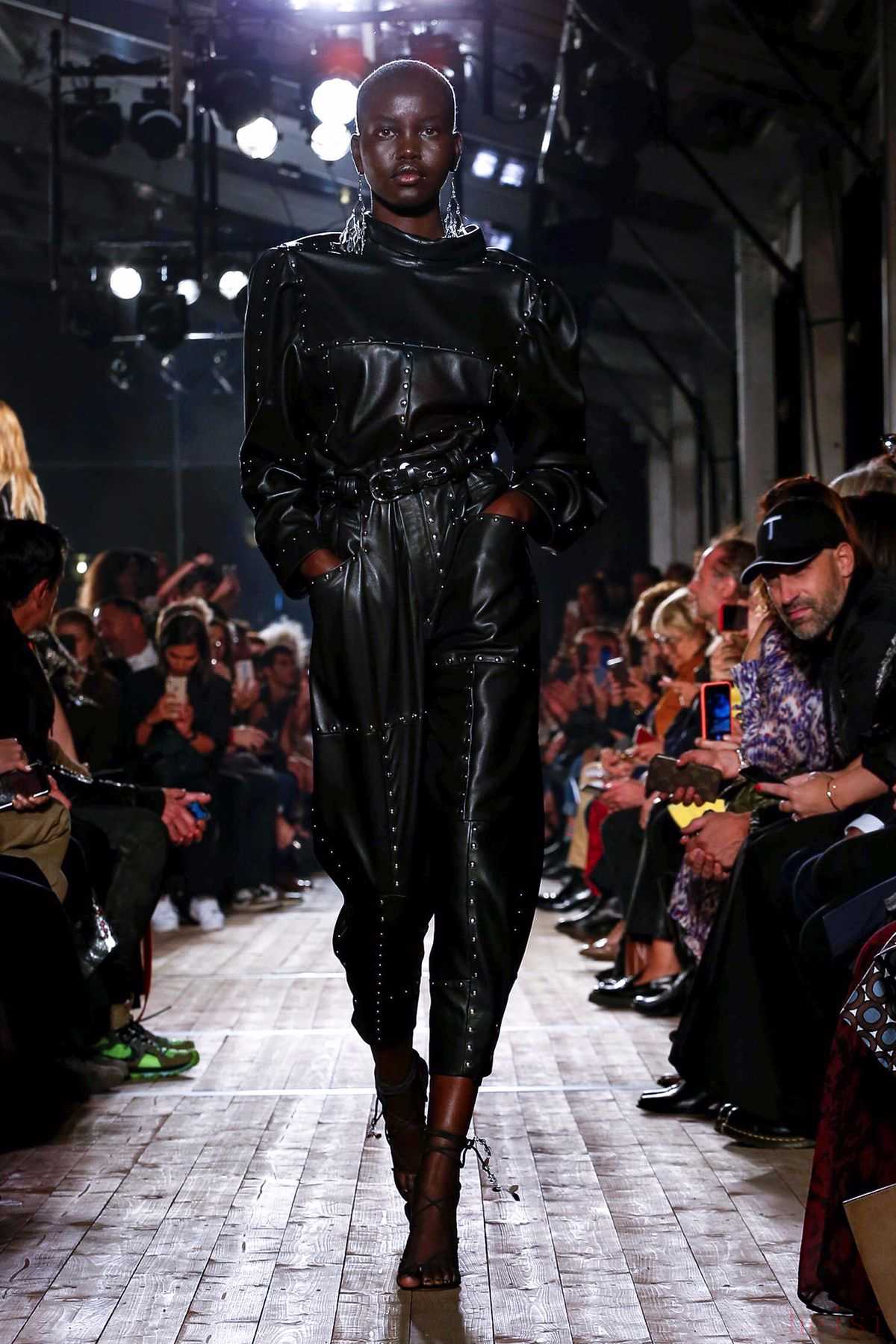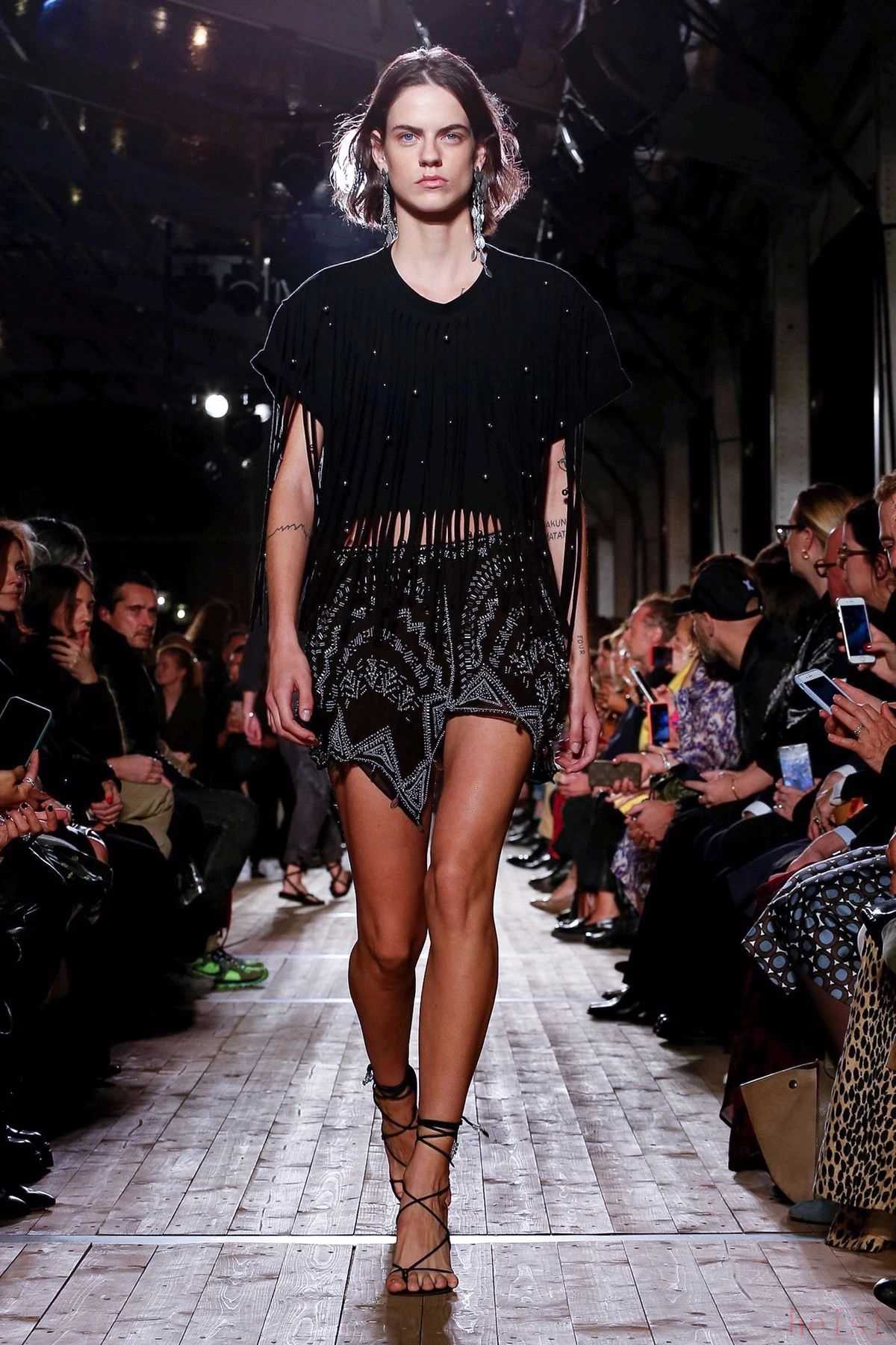 最后黑人模特Adut Akech身穿皮革鉚釘工裝驚艷閉秀,皮革與鉚釘?shù)哪Φ桥c朋克讓Isabel Marant也變得不僅僅是瀟灑那么簡單。本季設計師收到了巴西的Baile funk音樂的影響,融合了強烈的巴西風格。