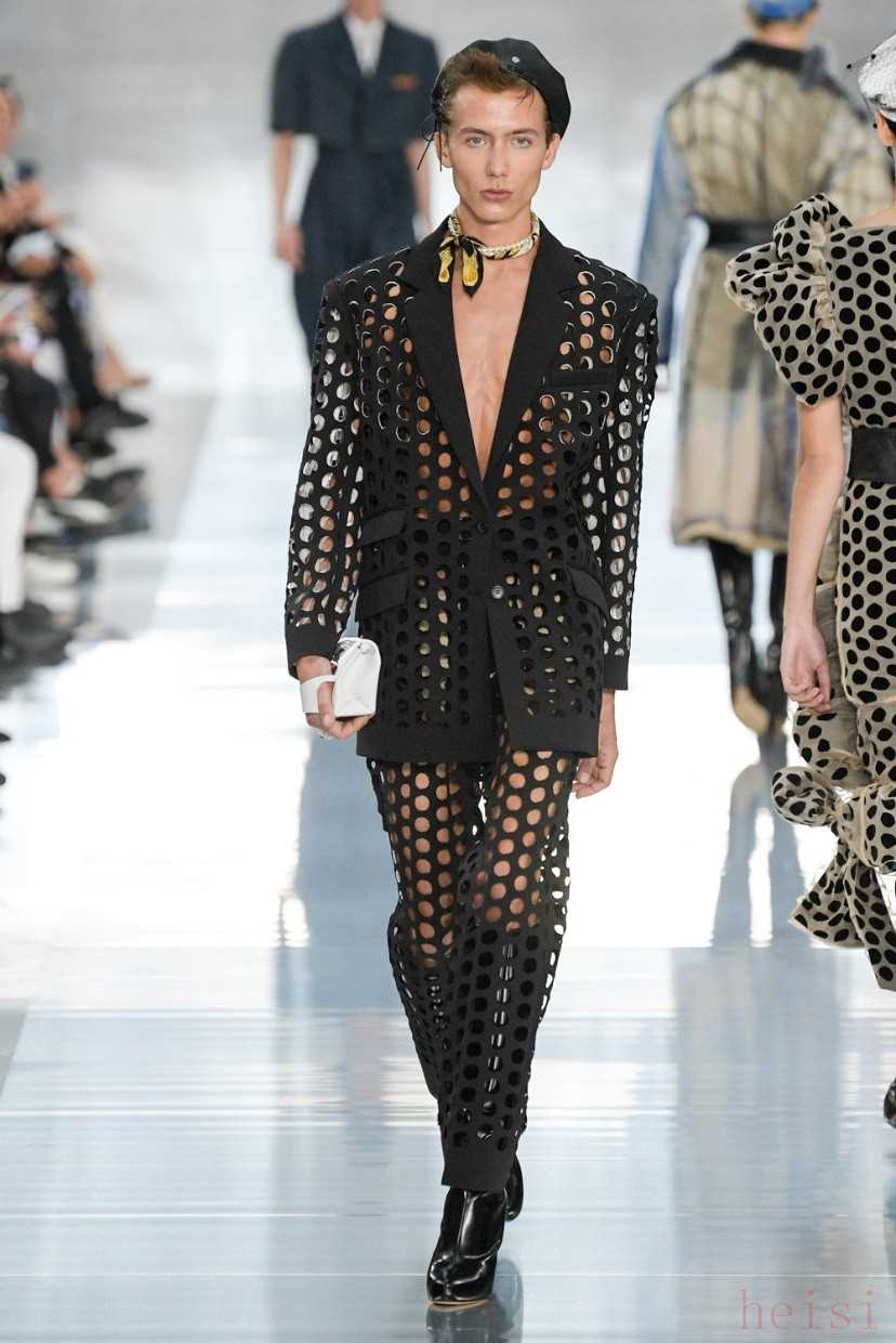 Maison Margiela 全新「“Défilé” Co-ed 」系列以戰(zhàn)爭為主題,聚焦20世紀的軍服和西裝文化。以量身定制的西裝外套為主,為了替較為乏味的軍裝呈現(xiàn)新意,延續(xù)了2019秋冬高定經典的波爾卡圓點鏤空設計,剪裁依舊精湛。