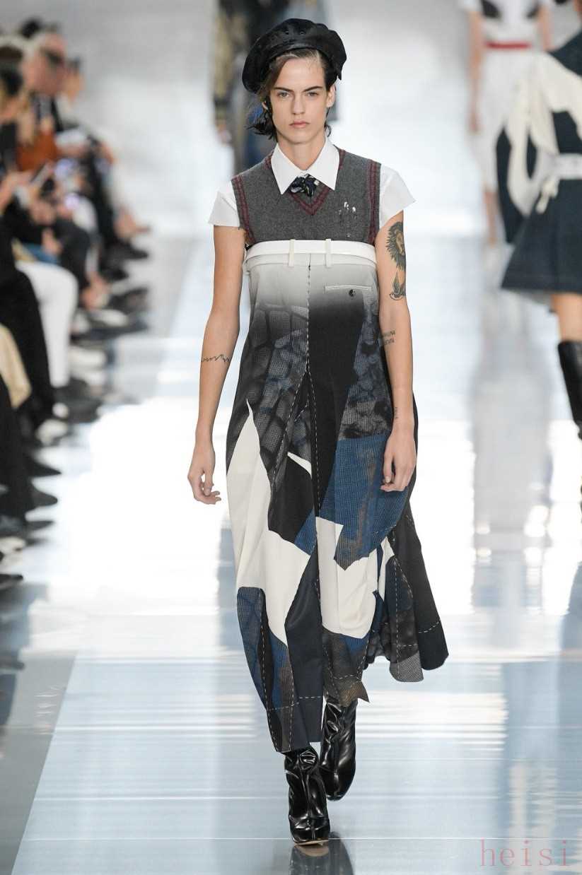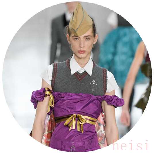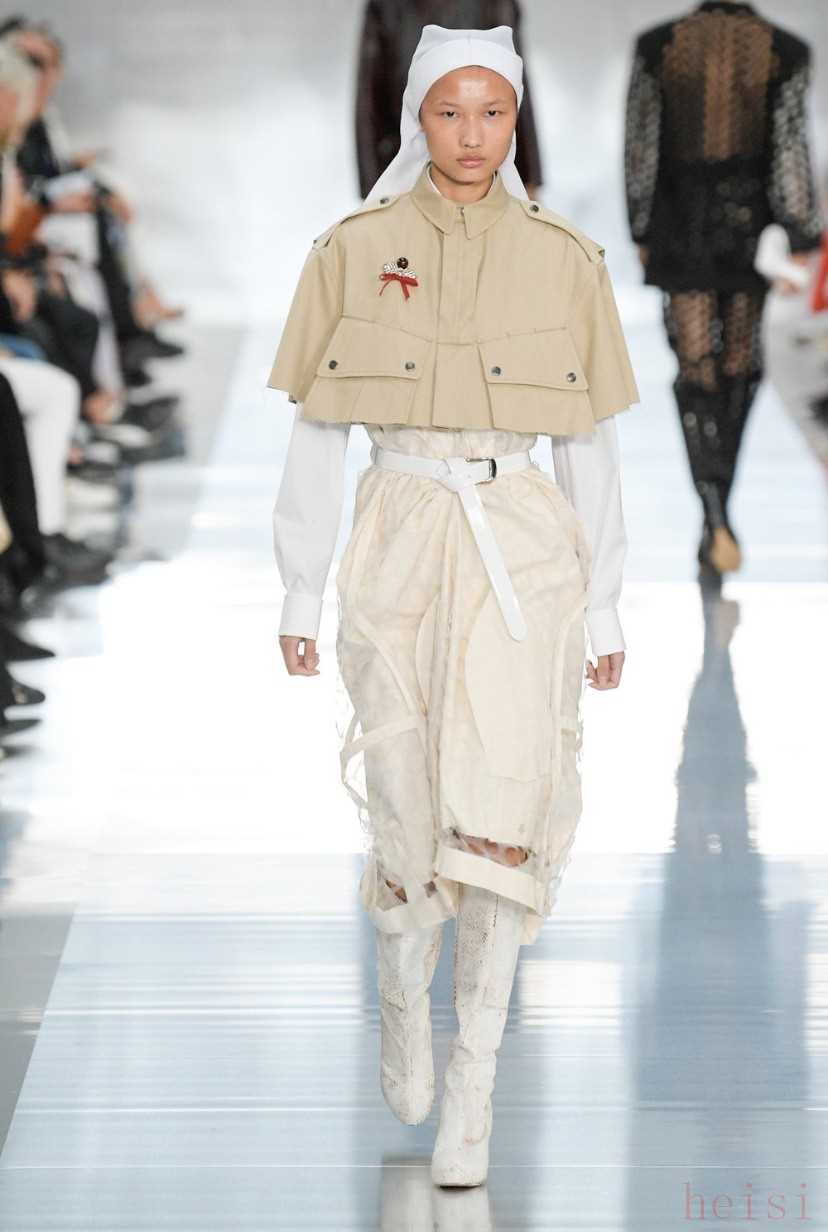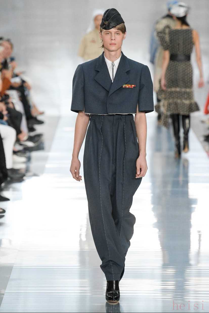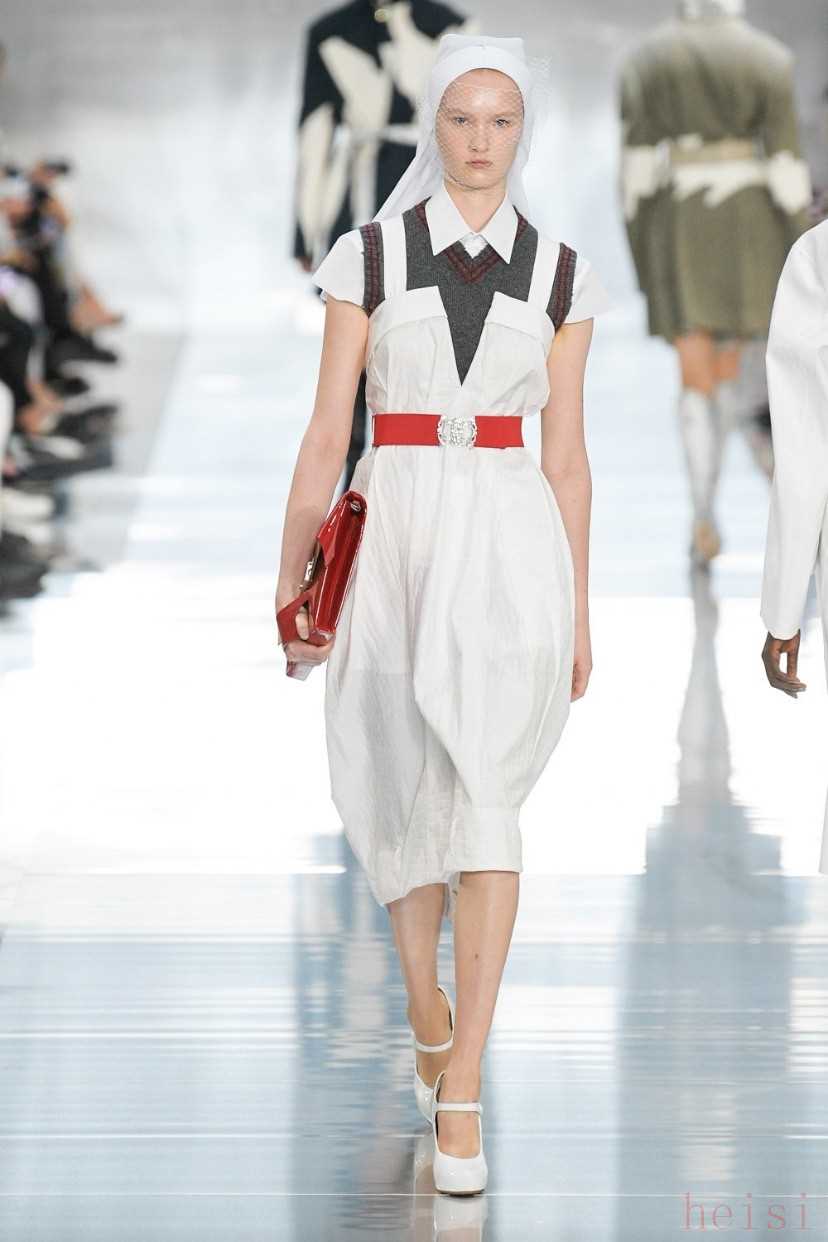 John Galliano延續(xù)了最擅長的海軍風格,拼接式的剪裁,極為精妙,針織背心和套頭衫強調出男女同校的制服感。散發(fā)著充滿青春荷爾蒙的朝氣。佩戴的帽子是不是很像護士帽?沒錯護士裝也是本季的靈感來源之一。