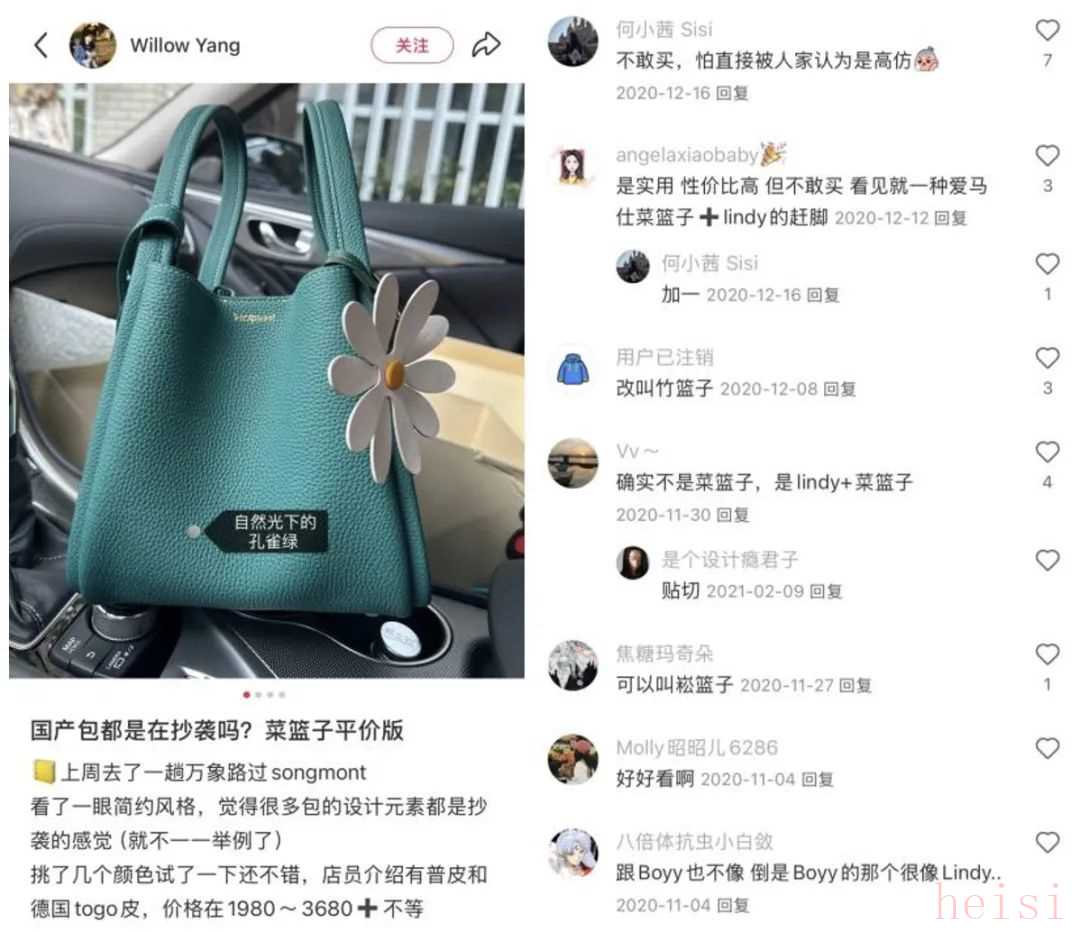 圖源:微博截圖人氣度能直接反映品牌知名度,千元國產(chǎn)包在火熱的當(dāng)下,也依然只能算小眾。當(dāng)品牌知名度不夠,不管國產(chǎn)包多強(qiáng)調(diào)設(shè)計(jì)靈感立足于東方文化,還是不可避免被當(dāng)成“大牌平替”。比如山下有松的爆品之一“菜籃子系列”,曾被一些人質(zhì)疑是愛馬仕Lindy和菜籃子兩款的結(jié)合體,并表示“不敢買,怕直接被認(rèn)為是高仿”。