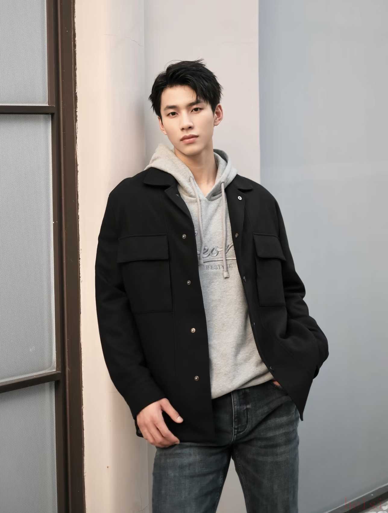 灰色連帽衛(wèi)衣配上黑色工裝夾克,非常年輕活力的一套穿搭,適合剛出社會的陽光男生或者男大學生們。