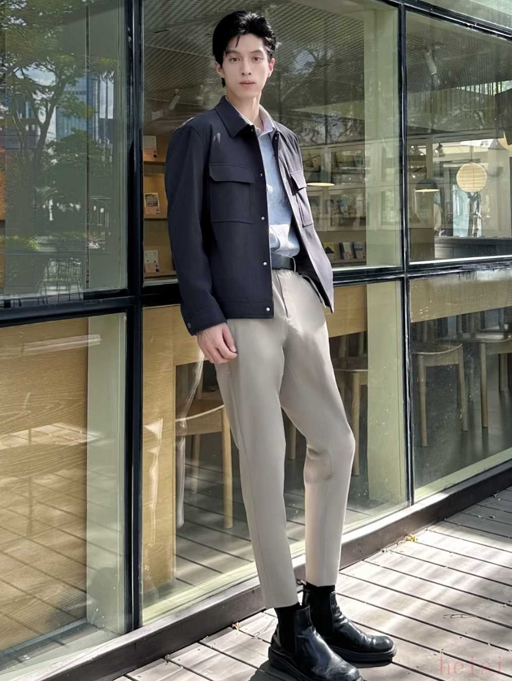 同樣的工裝夾克配上條紋襯衫后,就變得成熟穩(wěn)重起來,西褲的加持讓整套穿搭干練又休閑,職場新貴們的基礎(chǔ)風格。
