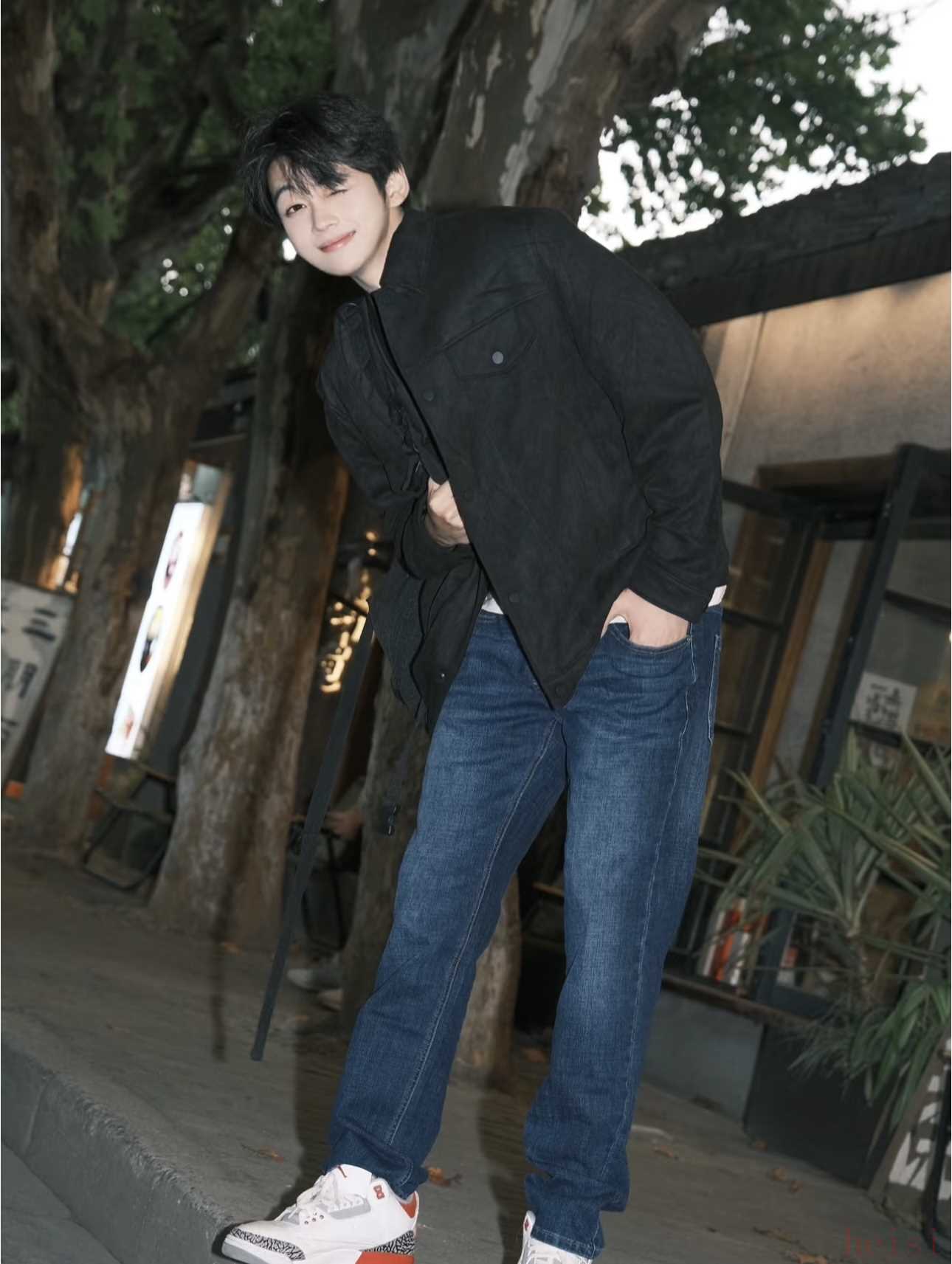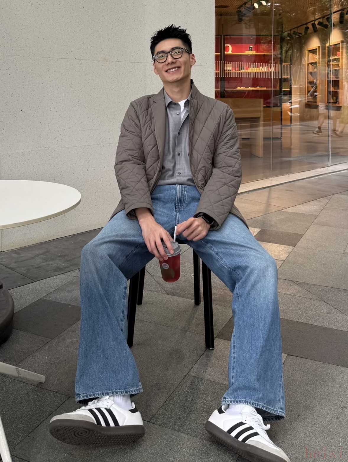 T恤+襯衫+輕羽絨外套,疊穿的時尚感輕松打造出來,下身則搭配藍色牛仔褲和德訓鞋,很有時尚港男的穿搭典范哦!