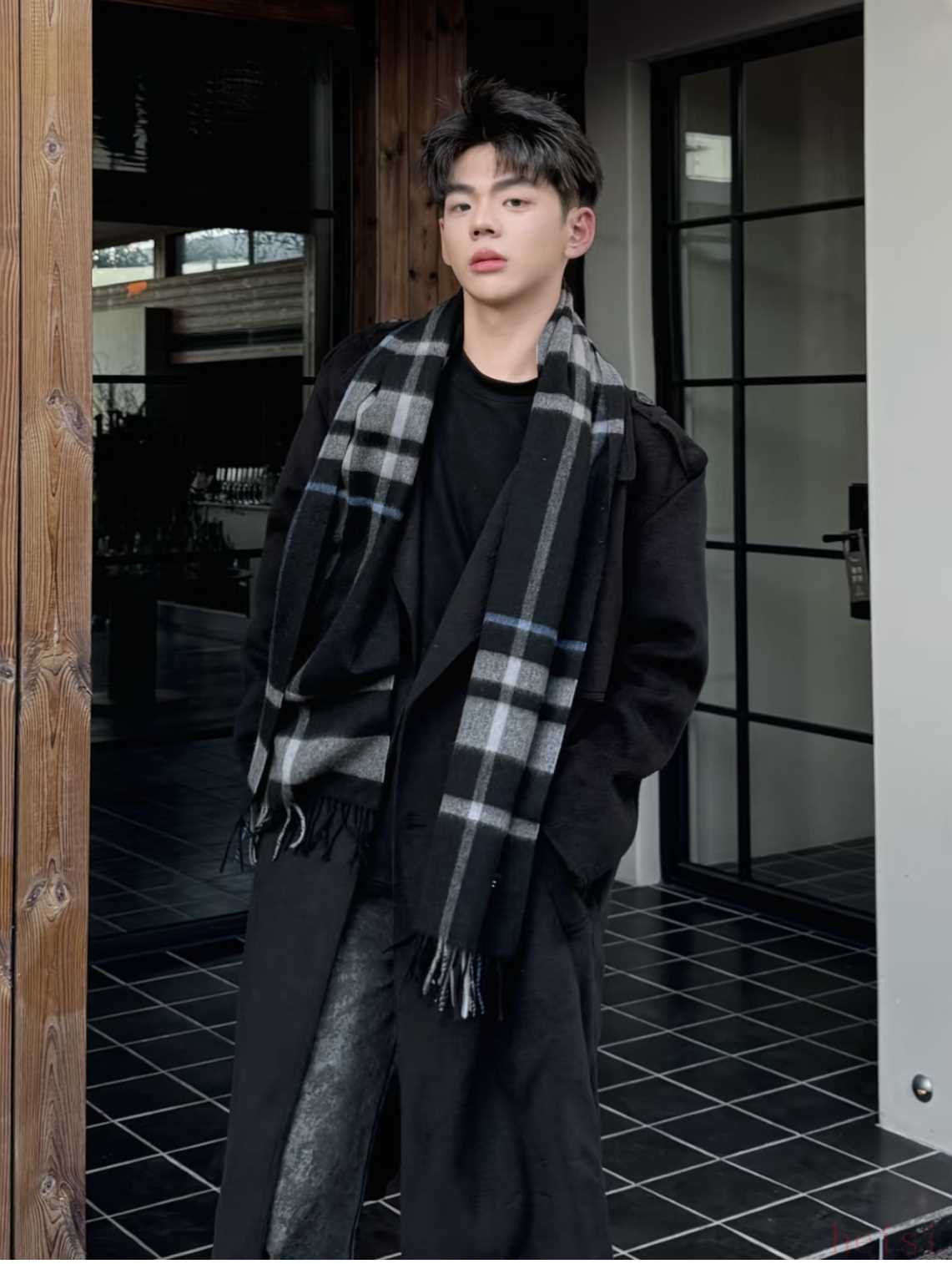 黑色內(nèi)搭配上黑色長款呢大衣,男士對于深色系的穿搭把握非常嫻熟,再配上黑白格紋圍巾,韓劇男主氛圍感穿搭拿捏。