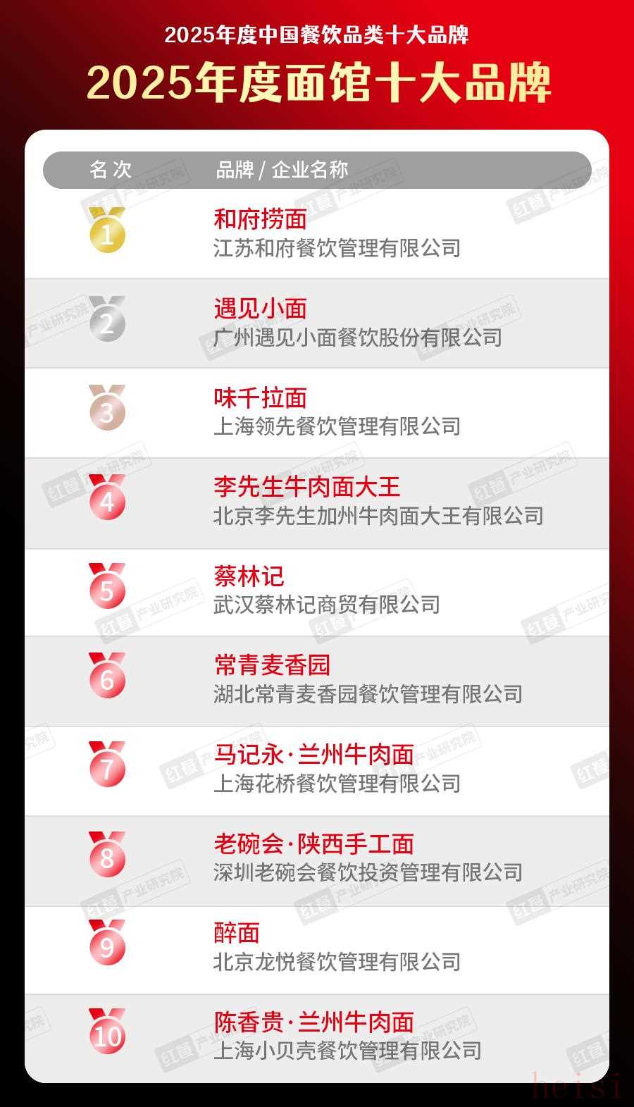 在“2025年度面館十大品牌”榜單上,和府撈面、遇見小面、味千拉面、李先生牛肉面大王、蔡林記、常青麥香園、馬記永·蘭州牛肉面、老碗會·陜西手工面、陳香貴·蘭州牛肉面等一眾品牌持續(xù)在榜,彰顯出強大的品牌韌性;而醉面則憑借自身實力,于本年度新晉登榜。