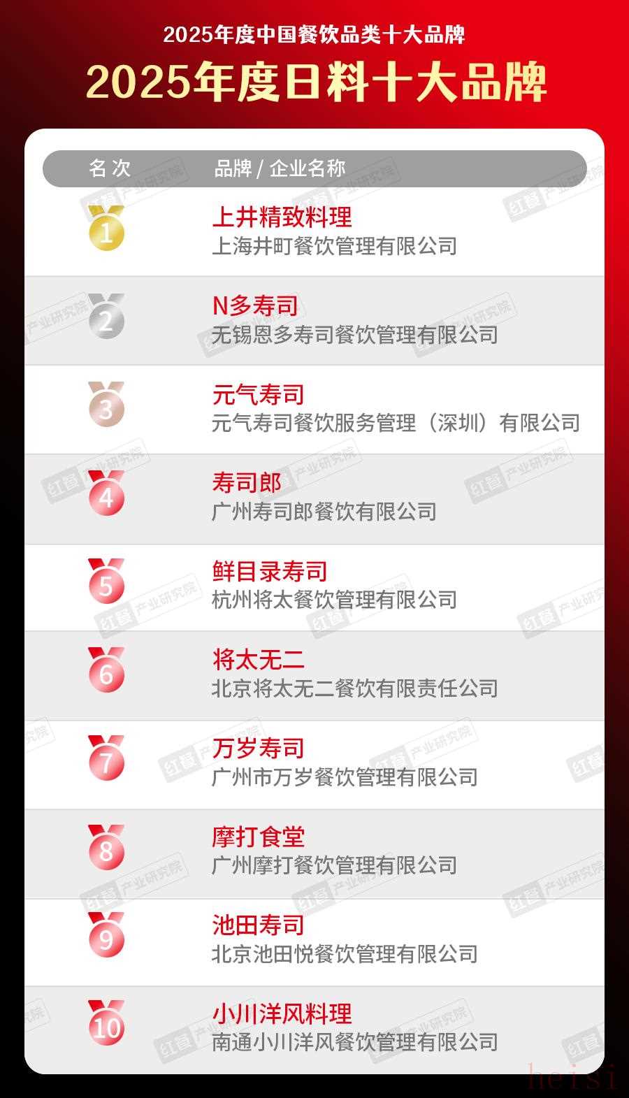 在“2025年度日料十大品牌”榜單中,上井精致料理、N多壽司、元氣壽司、壽司郎、鮮目錄壽司、將太無二、萬歲壽司、摩打食堂、池田壽司、小川洋風(fēng)料理等品牌赫然在列。這些上榜品牌在定位轉(zhuǎn)型、本土化創(chuàng)新、服務(wù)品質(zhì)、品牌影響力等諸多方面均展現(xiàn)出特色亮點。