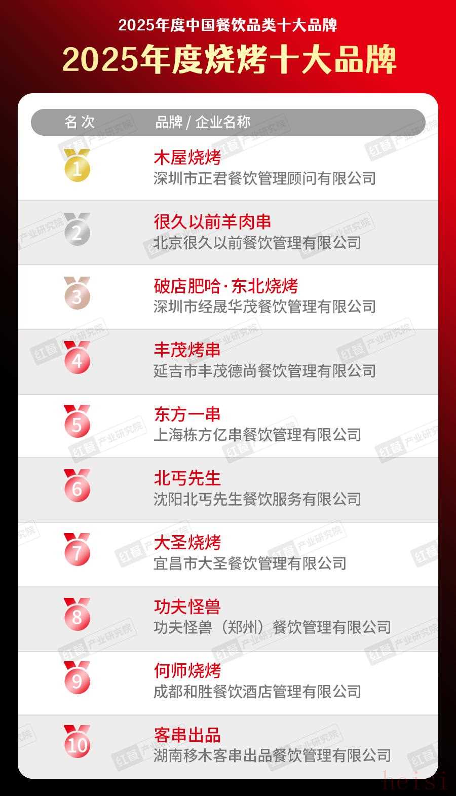 在“2025年度烤肉十大品牌”榜單中,日式烤肉占據(jù)1席,中式烤肉占據(jù)5席、韓式烤肉占據(jù)2席,朝鮮族烤肉占據(jù)2席。
