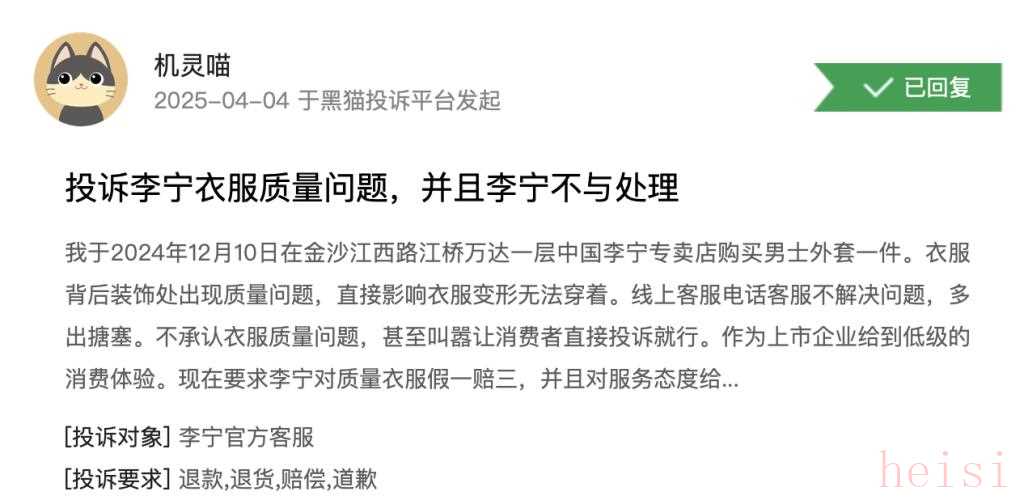 例如,一消費(fèi)者表示,自己在李寧線下專賣店購買的男士外套衣服出現(xiàn)質(zhì)量問題,影響衣服變形無法穿著。聯(lián)系客服之后,客服不承認(rèn)衣服質(zhì)量問題,甚至叫囂讓消費(fèi)者直接投訴就行。