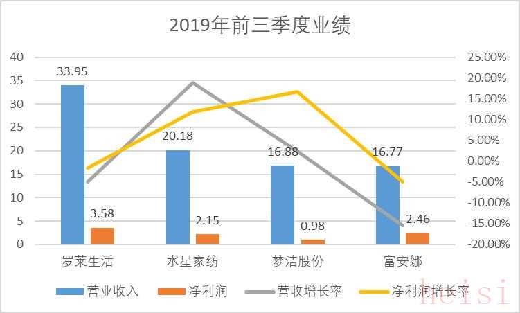 從整體來看,四家家紡企業(yè)在今年前三季度的平均營收增速僅為5.52%,而2017年和2018年的同期增速均在20%左右。對此,中金公司分析師郭海燕認為,家紡企業(yè)平均營收增速下滑,反映出家紡行業(yè)整體承壓。
