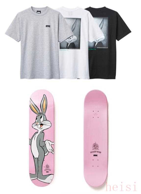 2017年美國(guó)滑板品牌FTC曾與兔八哥聯(lián)名推出滑板、T恤、徽章等單品,其中一款T恤的印花是黑白的兔八哥毛絨玩具形象,給人酷酷的感覺(jué),而滑板則是粉紅底色搭配彩色兔八哥印花,非??蓯?ài)。