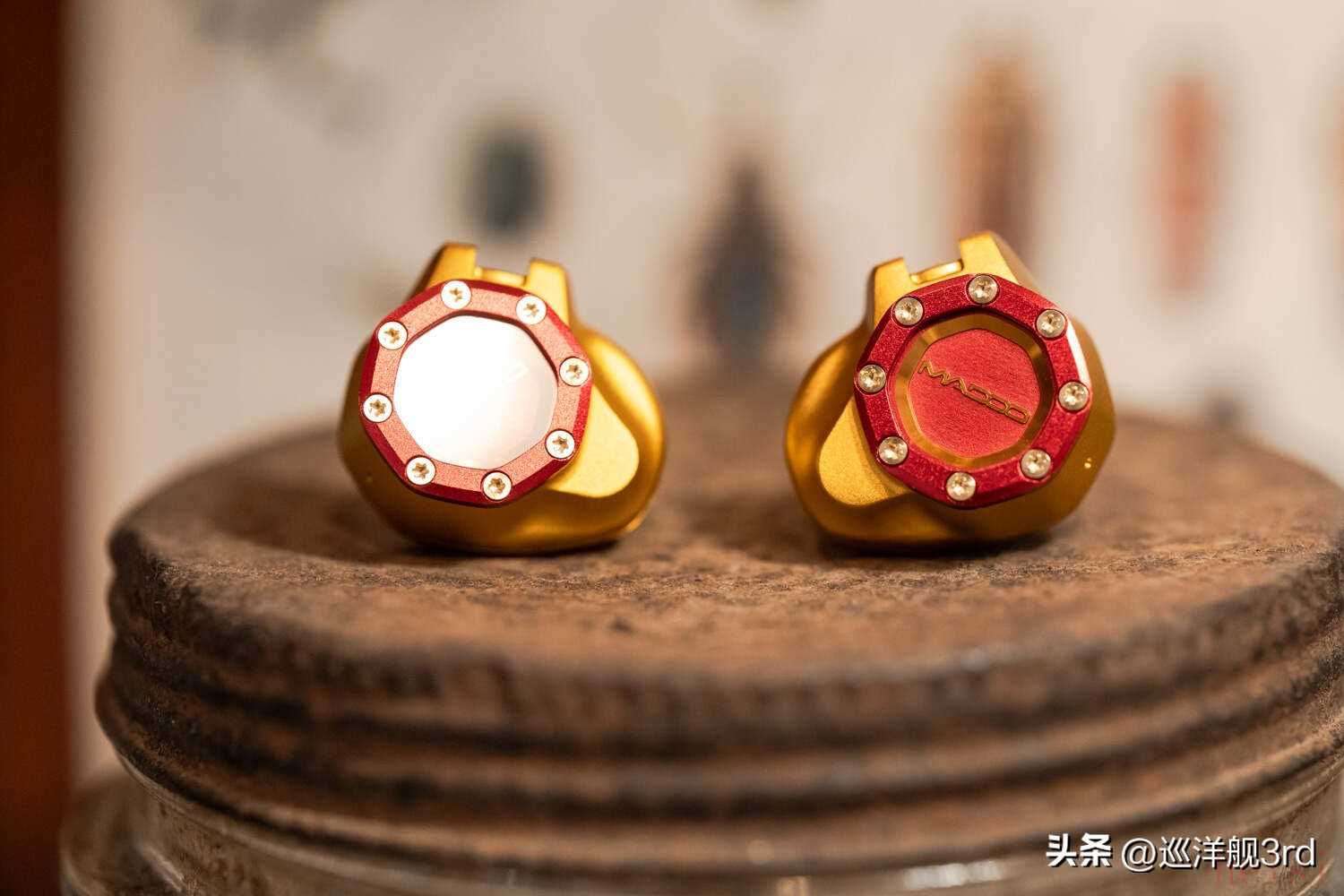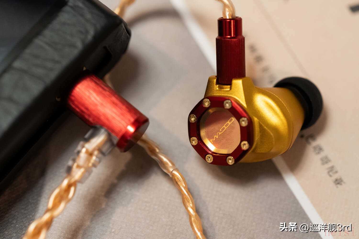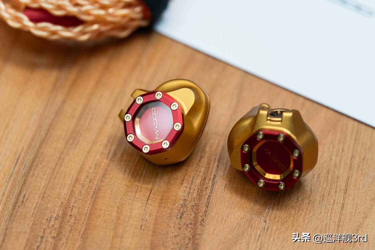 作為本文主角的Madoo Typ622被燒友們記住,坦白講大概率不是因?yàn)槁曇舳且驗(yàn)檫@個(gè)硬朗的、充滿(mǎn)機(jī)械感的精致外觀,尤其是神似潛艇舷窗或鐘窗表盤(pán)的面板,金屬圈+螺母設(shè)計(jì)和覆蓋中央的藍(lán)寶石水晶,堪稱(chēng)設(shè)計(jì)上的神來(lái)之筆,而藏于藍(lán)寶石之下的“Madoo”文字,散發(fā)著金色的光澤。除了起初的黑金配色之外,相信大多數(shù)人都更喜歡Typ622的這個(gè)紅金也就是“鋼鐵俠”配色,典雅貴氣的同時(shí),經(jīng)過(guò)噴砂處理的細(xì)膩鋁合金外殼散發(fā)出強(qiáng)烈的金屬質(zhì)感,從心理上也能給人以沉穩(wěn)可靠的暗示。再加上這款耳塞嚴(yán)絲合縫的工藝和出色的細(xì)節(jié)雕琢,比起一些售價(jià)貴很多的產(chǎn)品都要強(qiáng)上不少。本篇成文之前幾天,我?guī)е鳷yp622給一個(gè)本地?zé)雅笥崖?tīng)了一耳朵,聲音他雖然也挺喜歡,但臨走前還是一直念叨著這耳機(jī)的樣子“太尊了”——Typ622外觀設(shè)計(jì)與做工的優(yōu)秀,可見(jiàn)一斑。