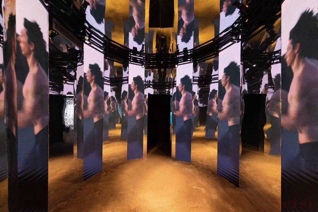 在其中一個區(qū)域內(nèi),兩側熒幕上,正分別播放著由導演Jonathan Glazer攜手演員Adam Driver打造的廣告大片。鏡面地臺映射出幕布上的影像,人站立其中仿佛置身于洶涌的海浪之中。耳畔伴隨著海浪拍打礁石的聲響,猶如置身于海岸旁。深入空間內(nèi)部,眾多屏幕與鏡子交錯排布,無限反射的鏡面帶來無限延伸的視覺感受。