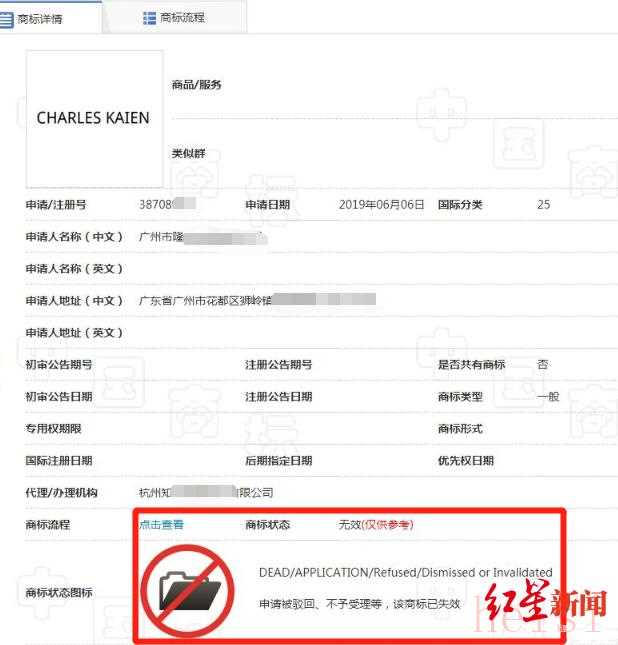 紅星新聞記者在國家商標(biāo)局官網(wǎng)查詢了解到,除去CHARLES & KEITH,文中提到的其中3個類似品牌中,有一個的商標(biāo)狀態(tài)為“無效”,另有兩個為“等待實質(zhì)審查”,只有一個品牌商標(biāo)顯示為“注冊”。