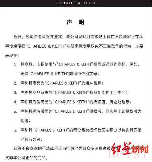 而事實上,早在2019年10月,CHARLES & KEITH官博就發(fā)布聲明稱:從未在中國大陸地區(qū)授權(quán)許可任何其他方以“姐妹品牌”“同工廠品牌”等形式經(jīng)營本公司品牌產(chǎn)品。