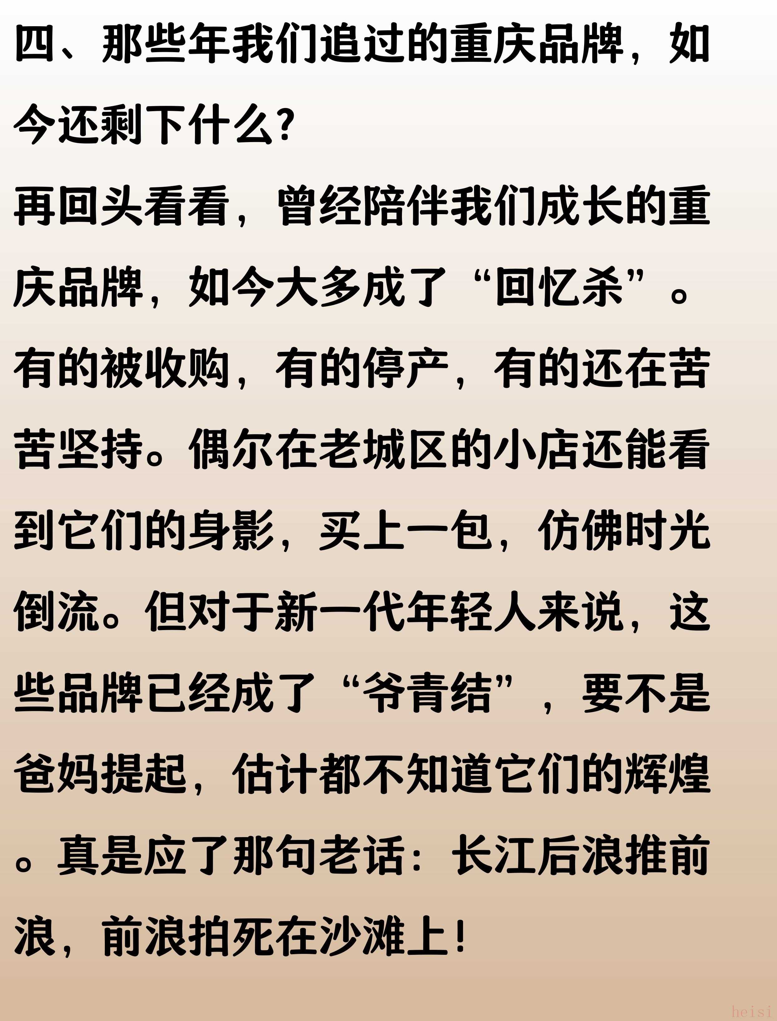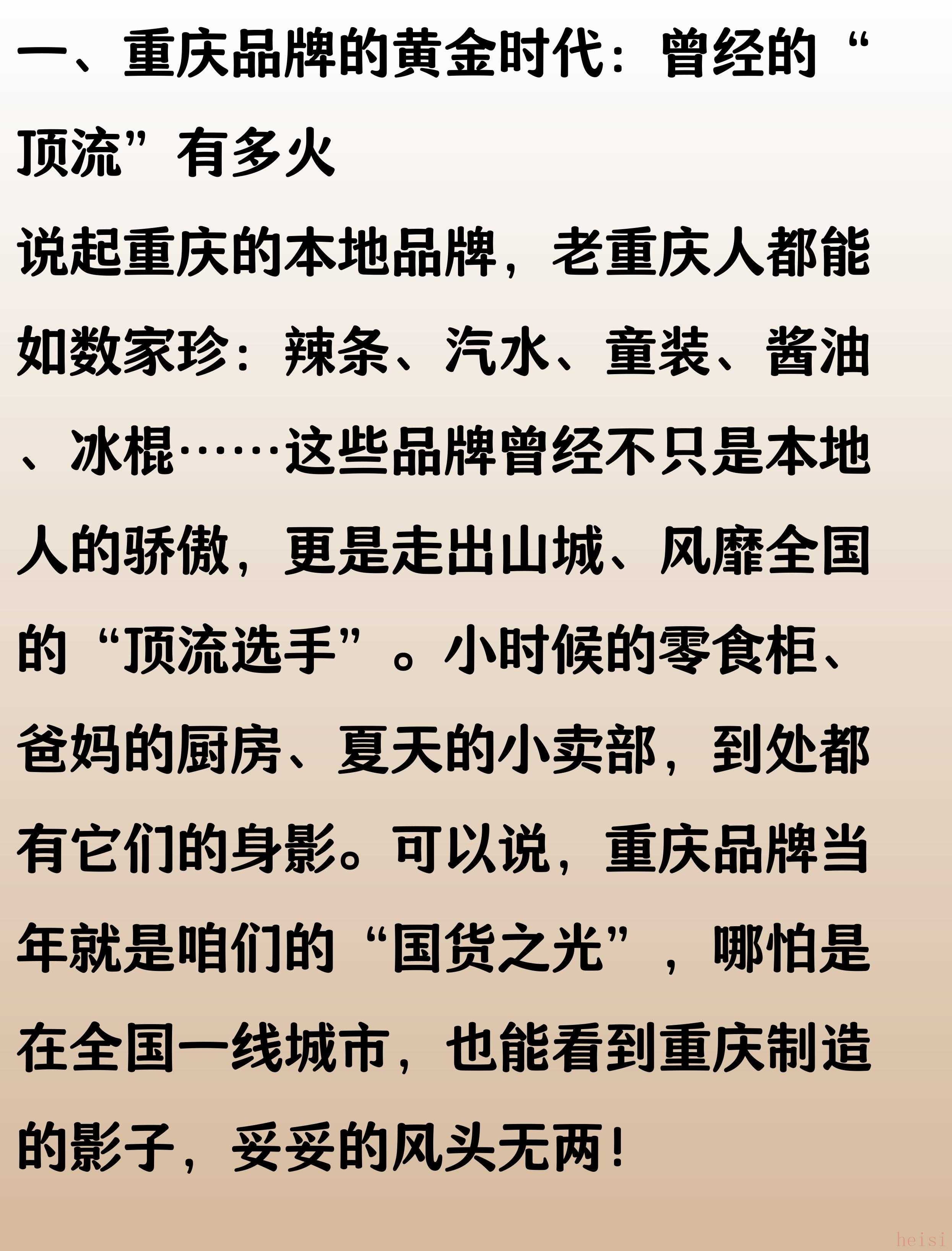 曾幾何時(shí),這些重慶品牌憑借獨(dú)特的魅力和過(guò)硬的品質(zhì),風(fēng)靡全國(guó),成為一代人的共同記憶。然而,時(shí)代的車(chē)輪滾滾向前,它們卻在激烈的市場(chǎng)競(jìng)爭(zhēng)中逐漸淡出人們的視野。品牌的消逝,不僅是商業(yè)的更迭,更是城市記憶的流失。今天,我們一起回顧那些曾經(jīng)輝煌,如今卻已消失的重慶品牌,感受屬于那個(gè)年代的獨(dú)特情懷。