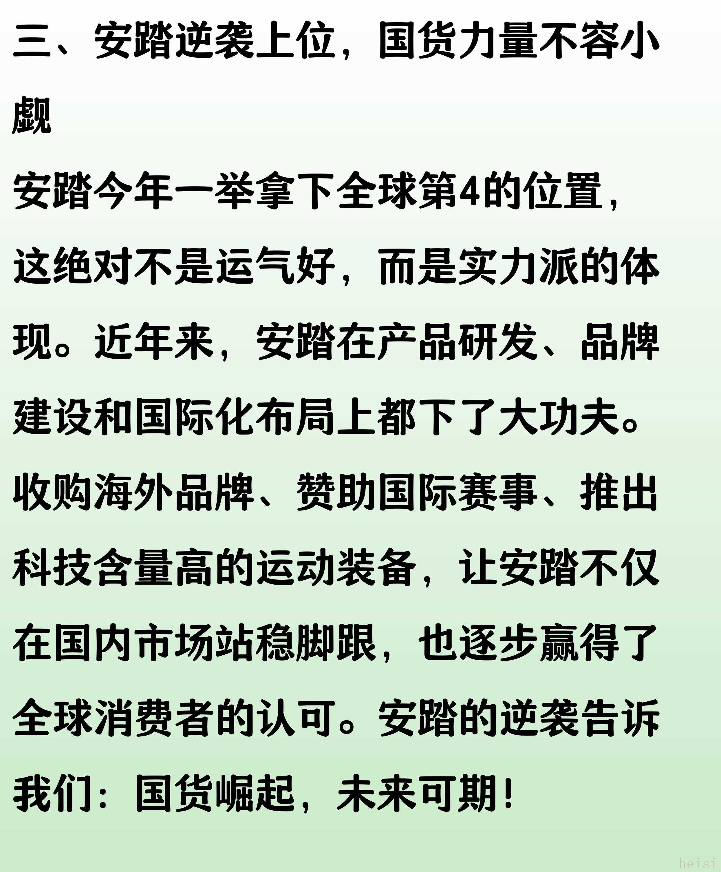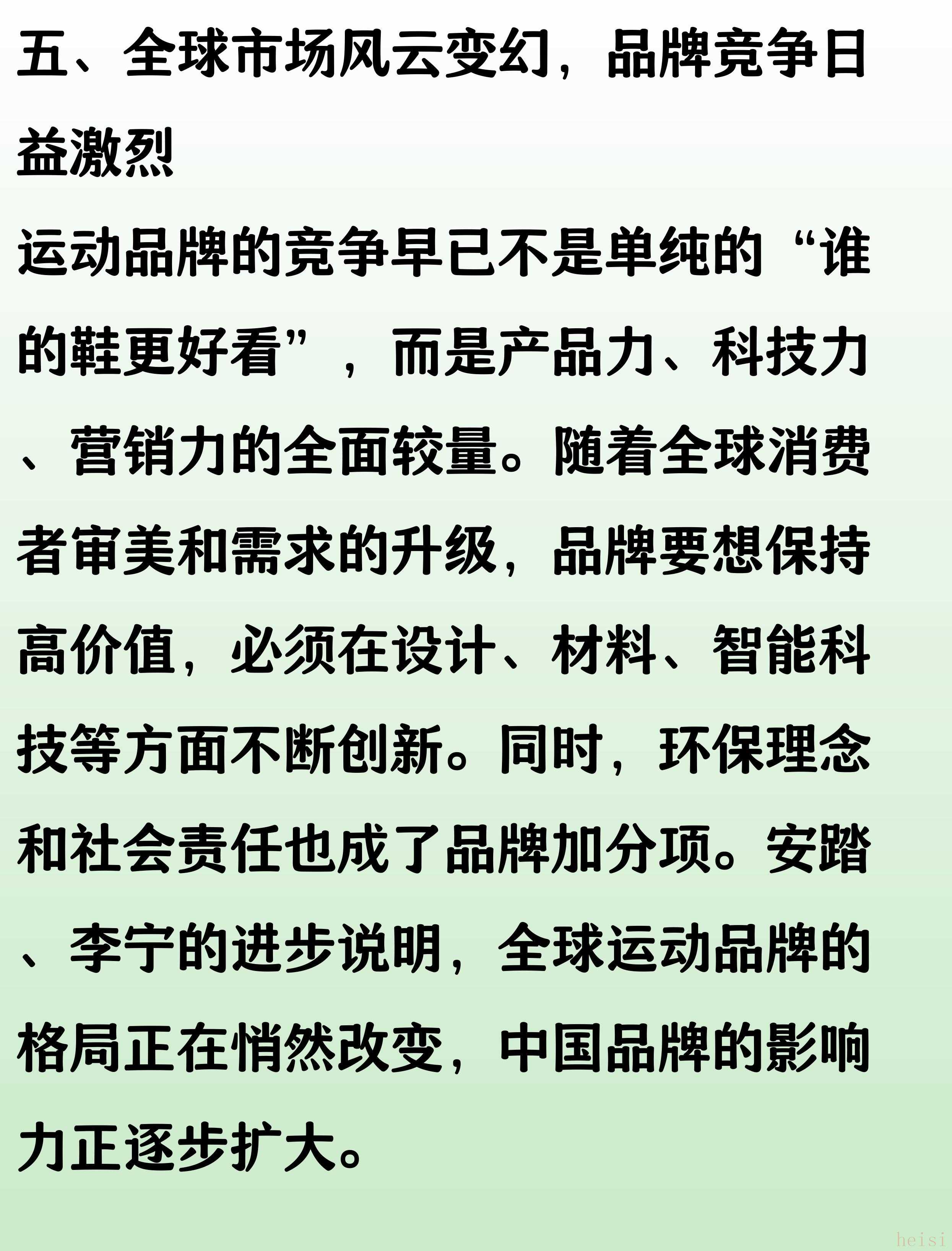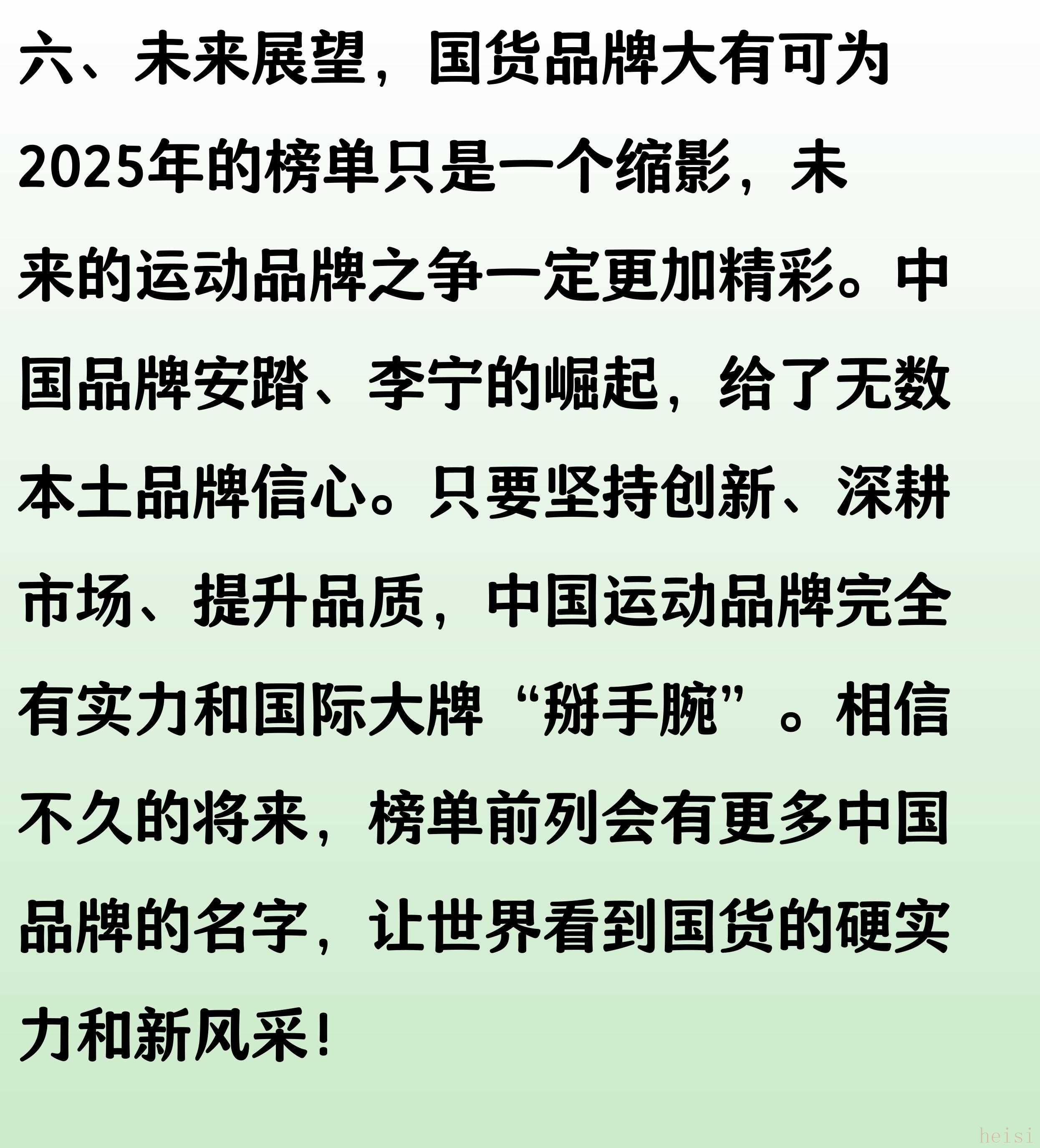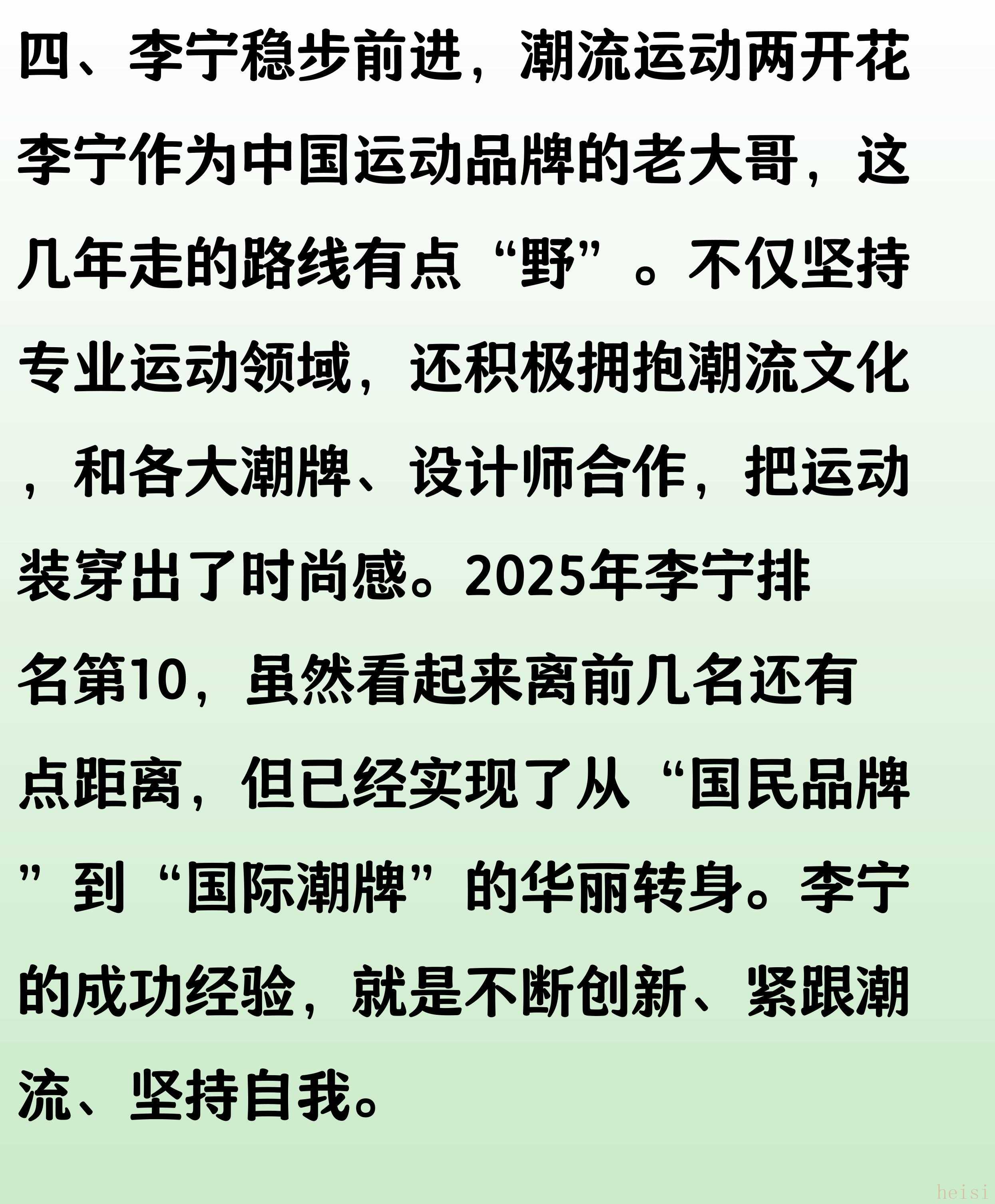看到安踏和李寧都沖進了全球前十,真的挺讓人自豪的!以前覺得運動品牌就是耐克、阿迪的天下,現(xiàn)在中國品牌也能站上世界舞臺,說明我們的實力越來越被認可了。希望未來有更多本土品牌能沖得更高,走得更遠,給世界看看中國制造的力量!