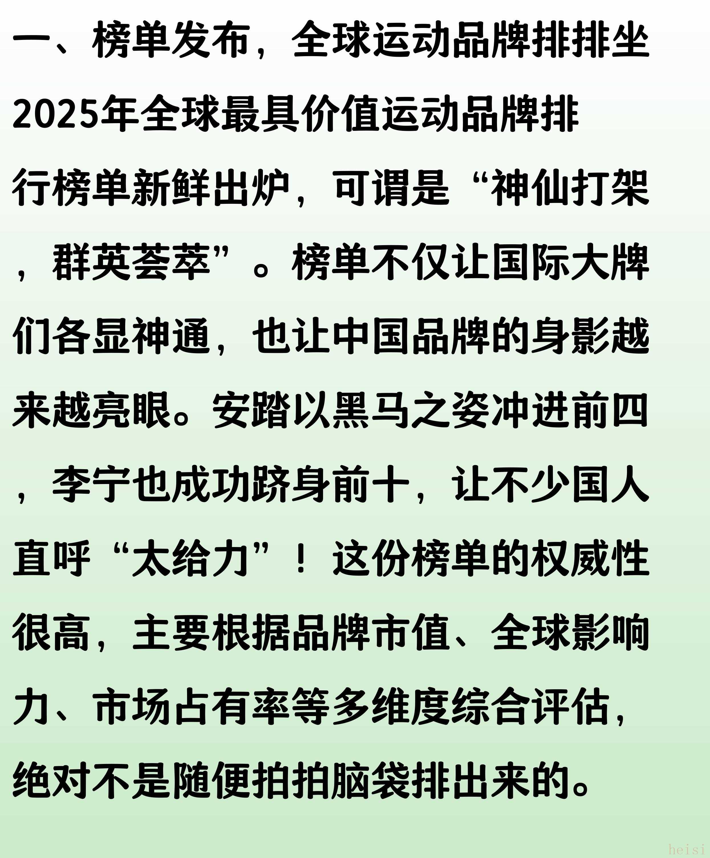 說到運動品牌,大家肯定都熟悉耐克、阿迪達斯這些老牌巨頭吧?不過這次榜單發(fā)布可有新變化!安踏沖進了全球第4,李寧也擠進了前10,咱們中國品牌真是越來越牛氣了!