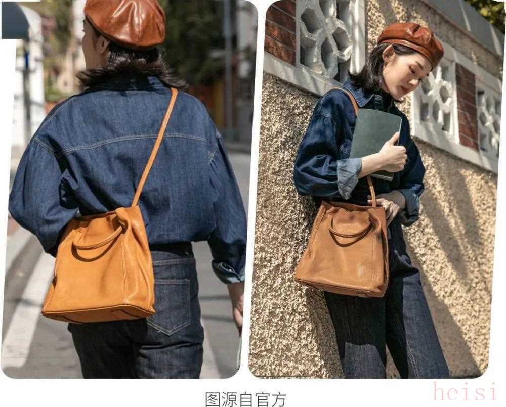 水桶包更是美拉德風(fēng)本尊,褶皺皮料越用越有故事感,隨手一搭就像給穿搭加了復(fù)古濾鏡。