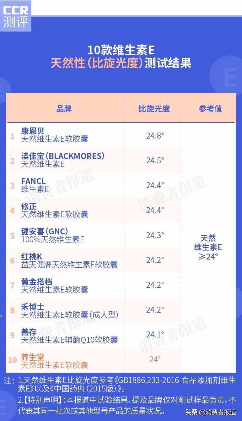 測試結果顯示,10款產(chǎn)品的比旋光度均≥24°,說明它們使用的原料為天然維生素E。不過,養(yǎng)生堂比旋光度只有24°,剛剛達到天然性“合格線”。