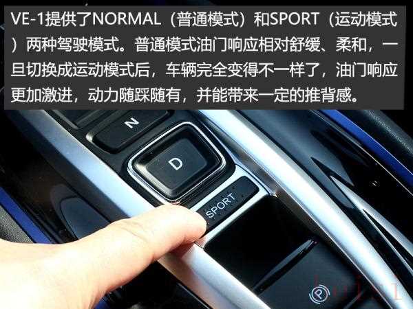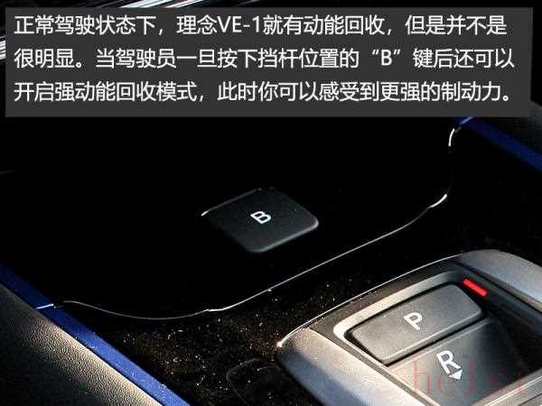 VE-1提供了NORMAL(普通模式)和SPORT(運動模式)兩種駕駛模式。普通模式和運動模式之間的區(qū)別還是很大的,普通模式油門響應(yīng)相對舒緩、柔和,一旦切換成運動模式后,車輛完全變得不一樣了,油門響應(yīng)更加激進,動力隨踩隨有,并能帶來一定的推背感。正常駕駛狀態(tài)下,理念VE-1就有動能回收,但是并不是很明顯。然而,當(dāng)駕駛員一旦按下?lián)鯒U位置的“B”鍵后還可以開啟強動能回收模式,此時你可以感受到更強的制動力。