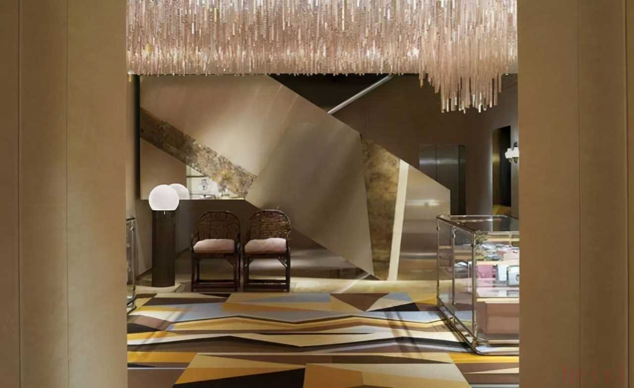 梅費(fèi)爾地區(qū)(Mayfair)位于英國倫敦威斯敏斯特市內(nèi),屬于倫敦最中心的一個城區(qū),也是一個時髦的富人聚集區(qū)。而芬迪(Fendi)正是在此設(shè)立了其時尚前衛(wèi)的精品店,門店的設(shè)計風(fēng)格很好地呼應(yīng)了它所在的地理位置:屋頂豪華奢侈的水晶吊燈,如同明亮閃耀的瀑布一樣,自上而下鋪展開來;地面上是拼接的復(fù)古幾何圖形地毯,營造出了極具視覺沖擊力的整體效果;而通往二樓的樓梯也十分的精致講究,內(nèi)襯是舒適的雙高馬海毛,復(fù)古的天鵝絨墻正掩藏其后,等著給消費(fèi)者們別樣的驚喜。