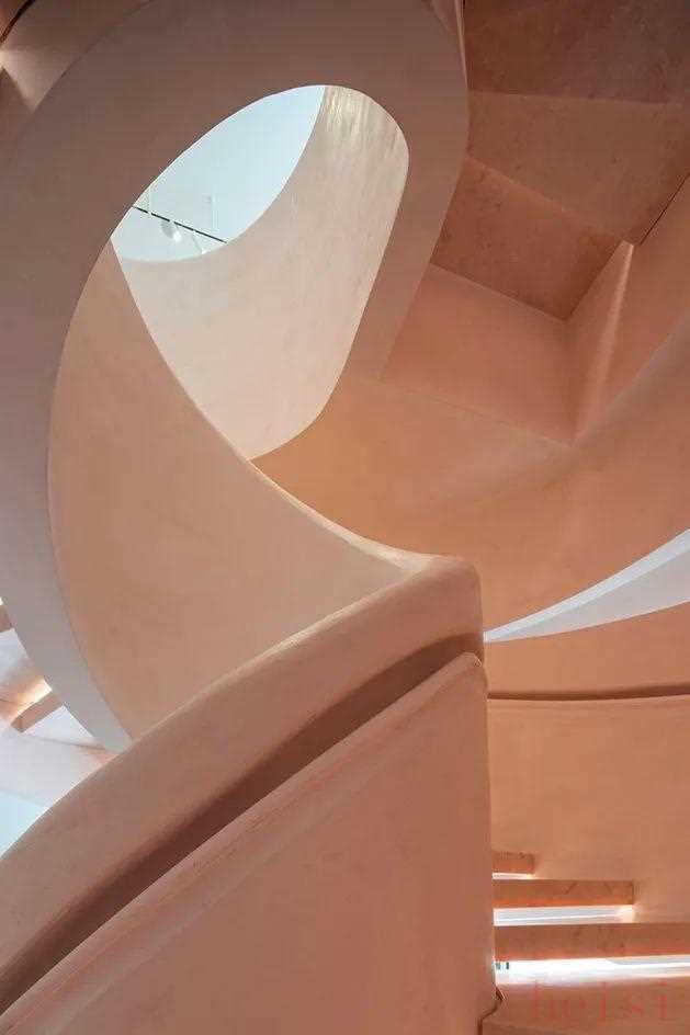 店內(nèi)最引人注目的就是在正中央建造了一個略顯陳舊的粉紅色石膏螺旋樓梯。丹尼爾對于利用不同建筑材料間的相互作用,包括黃銅、膠合板、皮革、樹脂和再生木材等,來營造出一種使人覺得平靜而且光線充足的空間非常沉迷,這一點(diǎn),在他所設(shè)計的配飾中也有所體現(xiàn)。除此之外,他還非常擅長對于顏色的把控,他總是喜歡使用一些藍(lán)色、橙色、綠色、大理石色調(diào)以及一系列特殊而少見的顏色,將其與純白色的置物架等其他配件并置,給人一種大膽而新穎的色彩碰撞感。