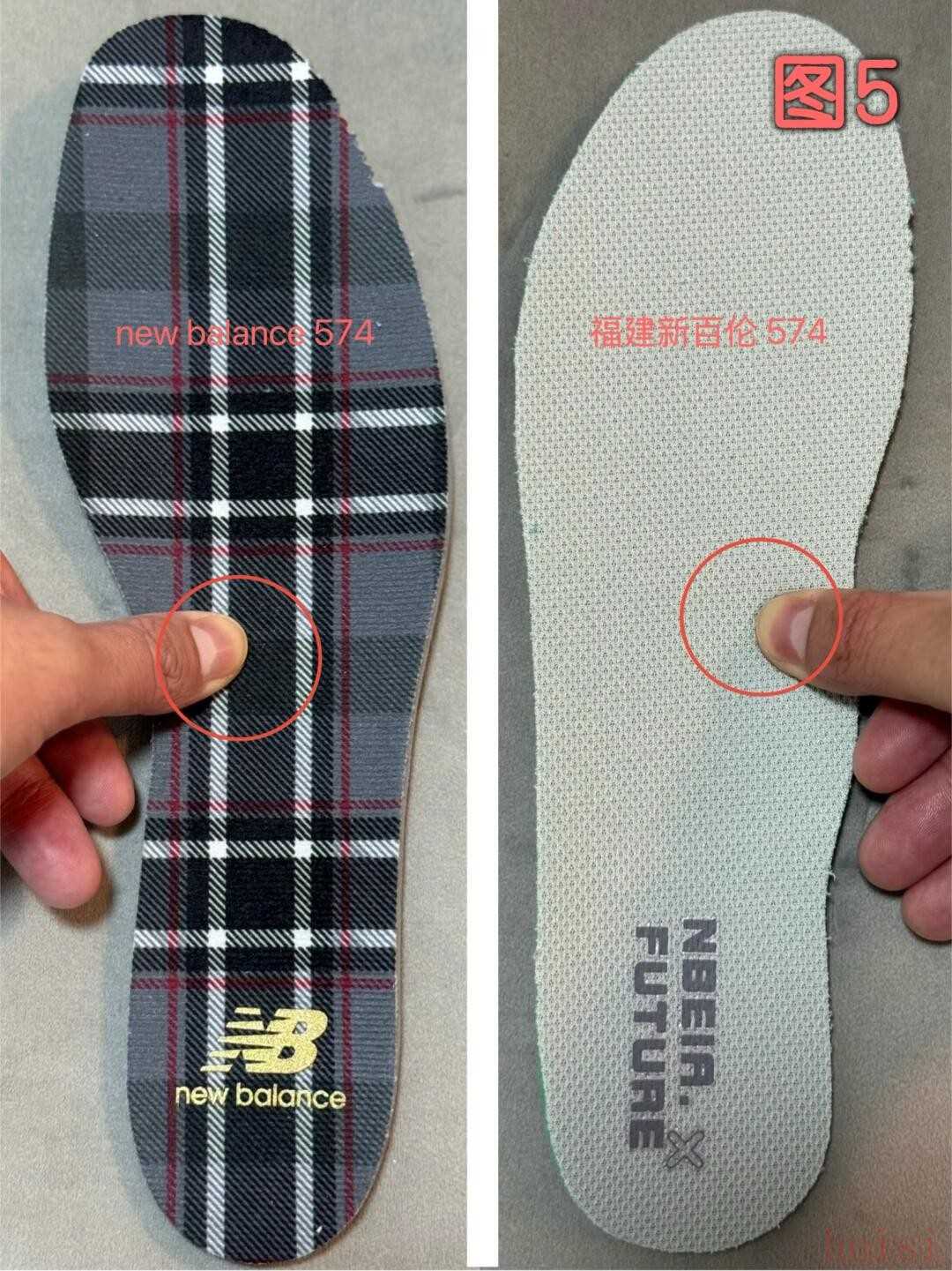 圖5,內(nèi)墊nb按上去柔軟有足夠的韌性,新百倫癱軟無(wú)韌勁,對(duì)于一個(gè)成年人的重量來(lái)說(shuō),韌性好一點(diǎn)的更舒適,太軟的沒有存在感。