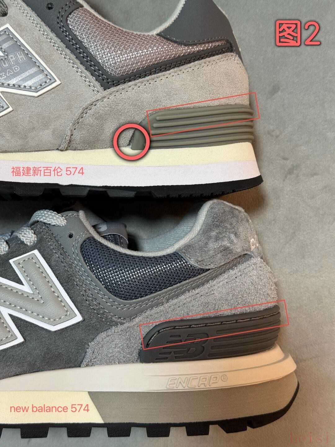 圖2,nb后跟的支撐架內(nèi)有走線,進(jìn)一步加固防止脫膠,紅圈內(nèi)新百倫的開模出現(xiàn)問(wèn)題,導(dǎo)致支撐架和鞋面有巨大的縫隙,這不是個(gè)例,可能是批次問(wèn)題。