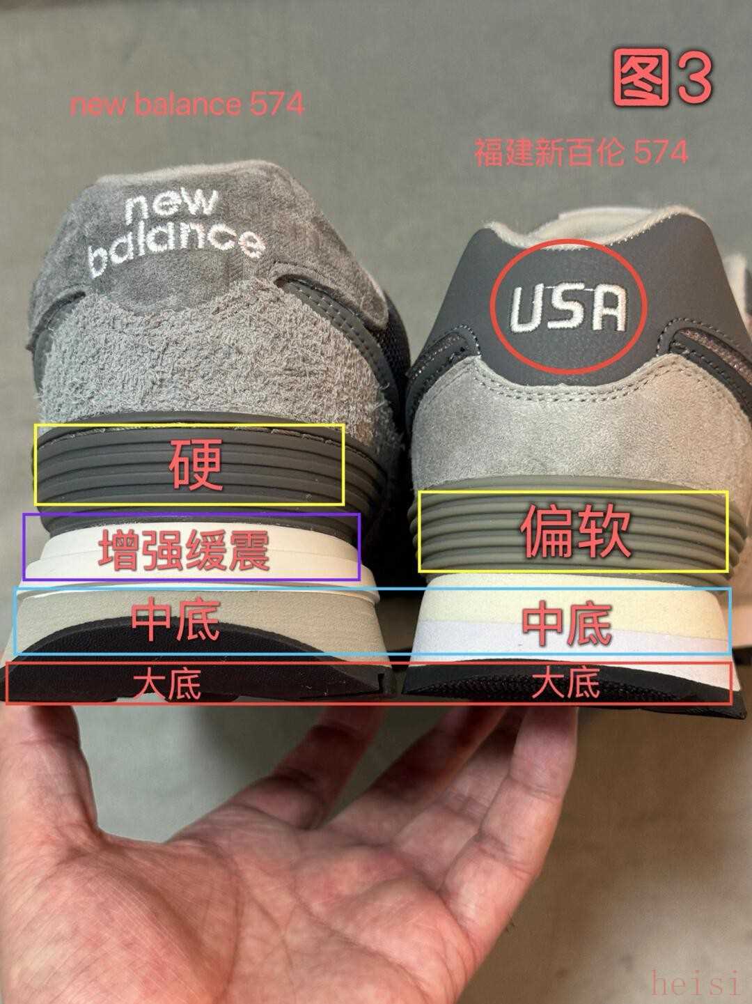圖3,兩款鞋最主要的差距就在這里,導(dǎo)致腳感完全不同,nb增加了一層ENCAP緩震(身高多增加2厘米左右),黃框內(nèi)的支撐架非常硬且厚,新百倫偏軟偏薄,最讓人匪夷所思的是新百倫鞋提刺繡了“USA”不清楚哪里和USA沾邊,還是為了以假亂真?